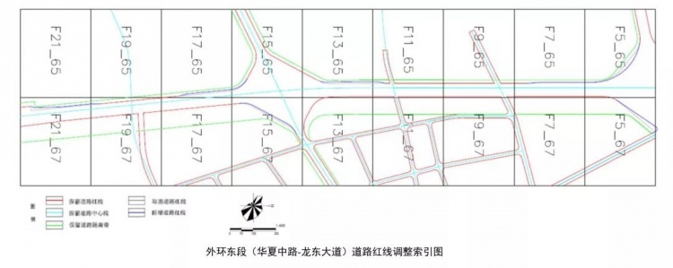 道路红线调整方案为:高科东路南北两侧为增设匝道及路口渠化,道路红线进行拓宽,最大调整宽度10米。规划对龙东立交西向南、南向东匝道和华夏立交北向西匝道处红线进行调整,解决现状道路边线超出规划红线的问题。同时为就近补绿,规划对龙东立交西南、东南象限红线以及外环-高科东路东南象限处红线进行局部调整。