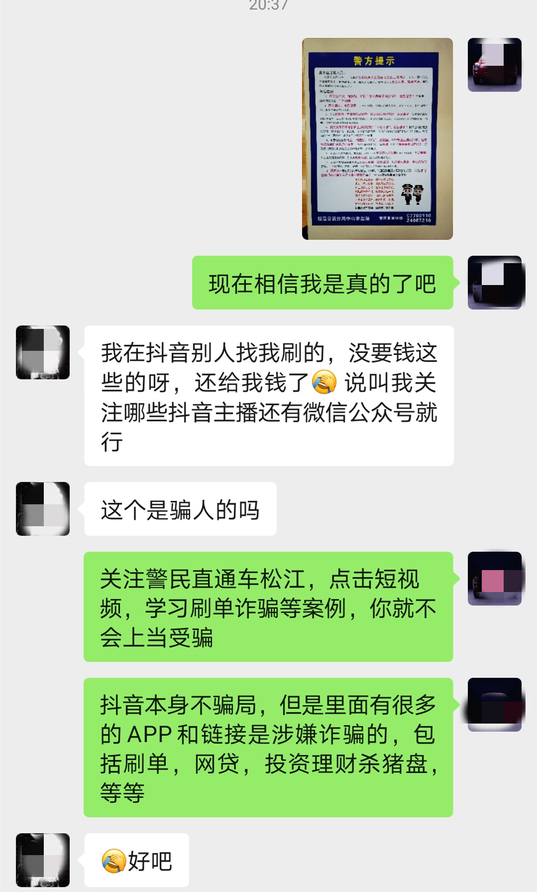 随后,对方建议张先生再充值4000元进行刷单,但由于当时张先生打不开该款客户端,所以此事便不了了之。第二天,对方再次联系张先生,问他4000元是否充值到位,并向他推送了新的下载链接,让其下载。正当张先生准备按部就班进行操作时,便收到了社区民警发来的短信提醒及微信好友申请。