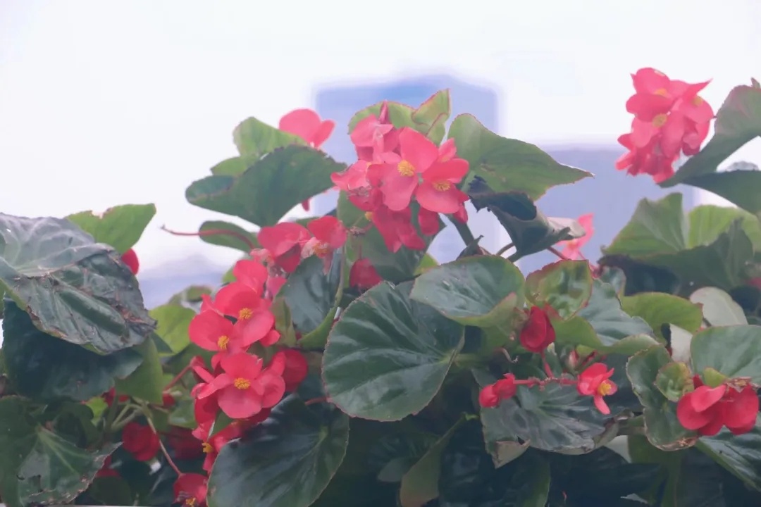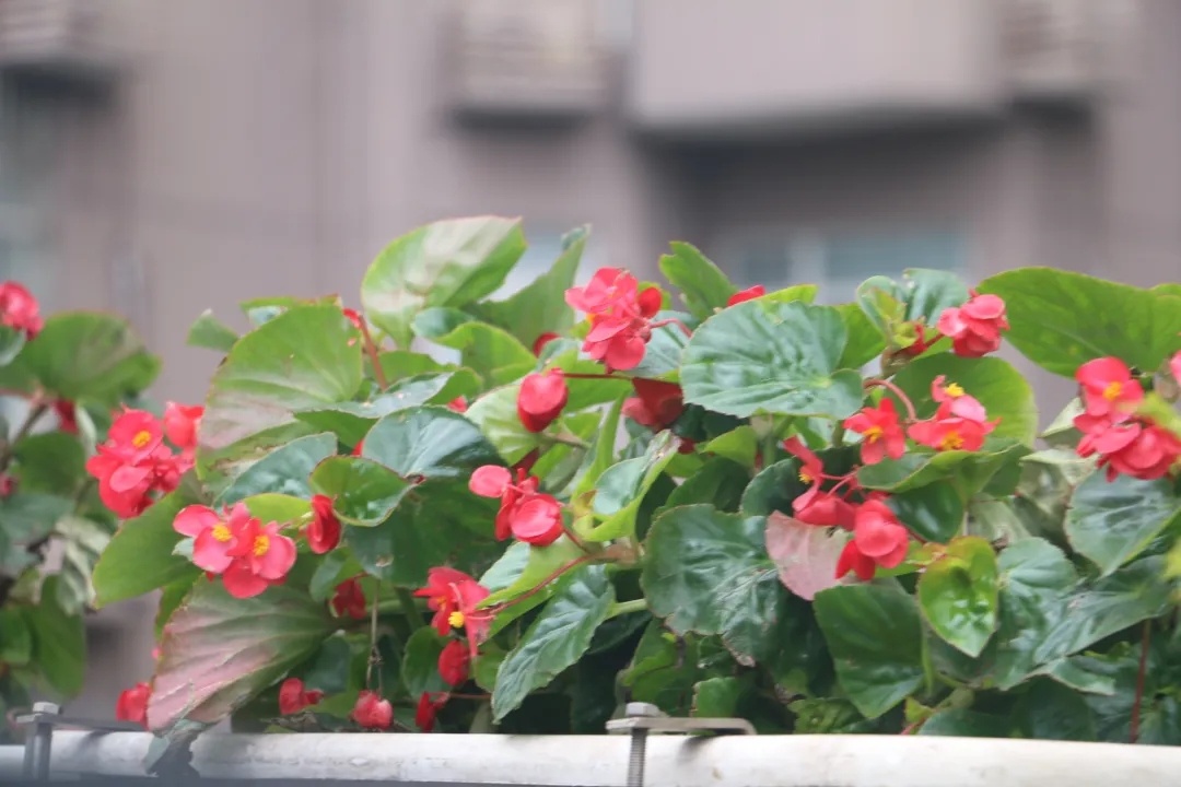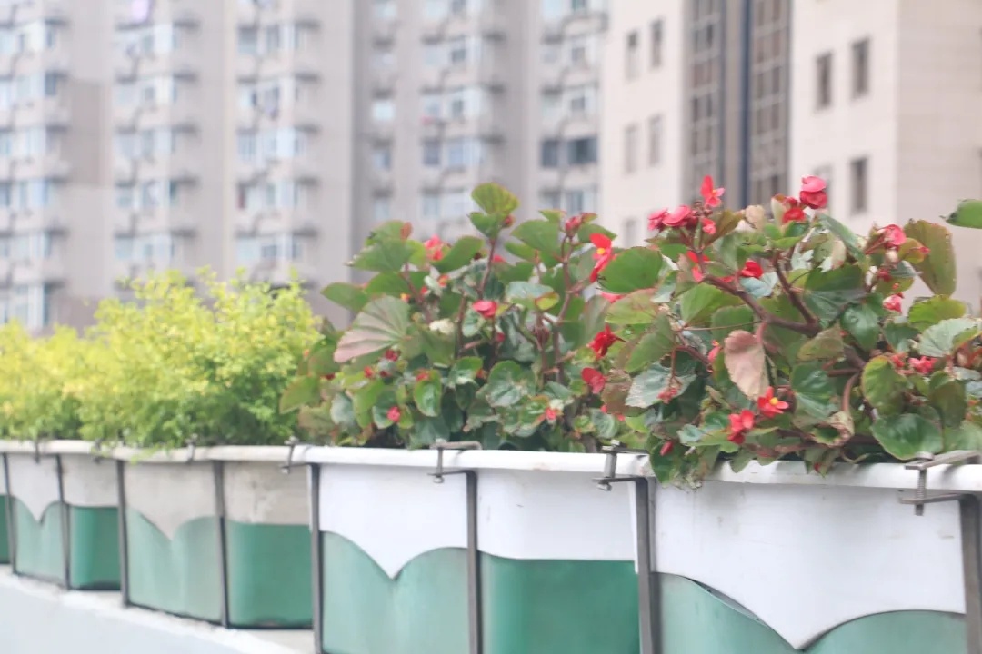 延中立交至延西立交采用组合摆放,运用5盆比哥海棠红花绿叶+3盆亮金女贞组合模式进行摆放。