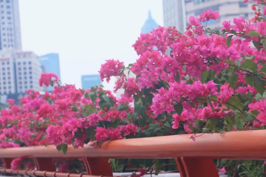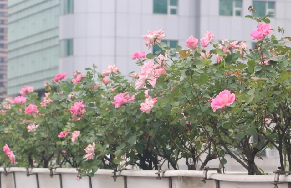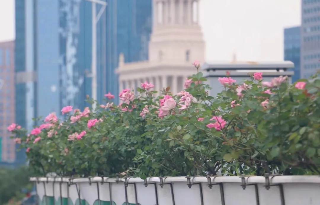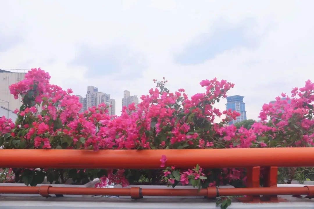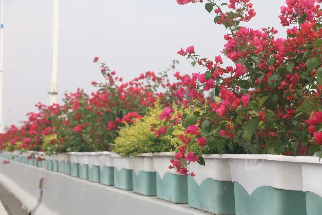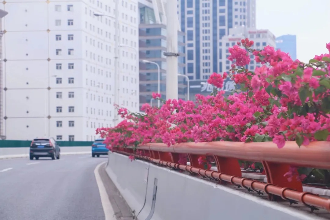 据悉,本次高架摆花是首次采用“单线+组合”的摆放形式,配花品种涉及到三角梅、月季“仙境”、比哥海棠、孔雀草和亮金女贞等。其中,外滩至延中立交、延西立交至沪青平立交以三角梅为主。
