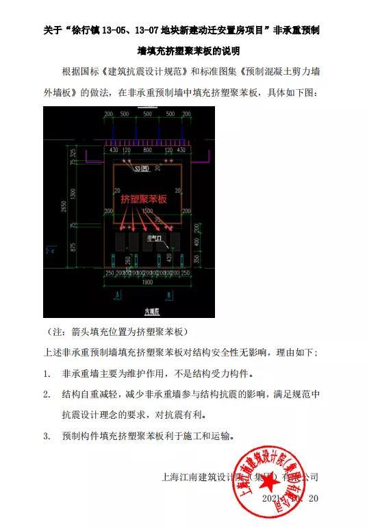 如果设计图就是如此,那么这样设计的意图是什么?记者又联系了小区的设计方上海江南建筑设计院(集团)有限公司,相关负责人拒绝了记者的现场采访,但是进行了书面回应,他们表示:在非承重预制墙中填充挤塑聚苯板,其依据为国标《建筑抗震设计规范》和标准图集《预制混凝土剪力墙外墙板》。在非承重墙填充挤塑聚苯板对结构安全性无影响,因为非承重墙主要为维护作用,不是结构受力构件;填充挤塑聚苯板后结构自重减轻,对抗震有利;方便施工与运输。