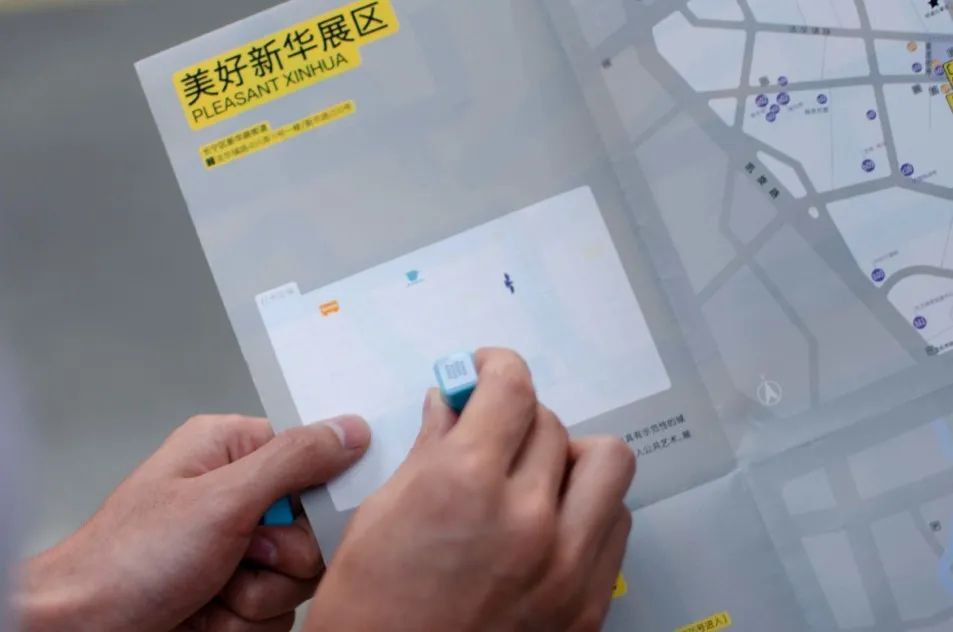 注意:导览地图上标注每一个点位(体验馆/展廊、参展项目、公共艺术作品),都是一个打卡点哦。这些分布在社区的参展项目和艺术作品都设有展签,与展签合影记录后,可去往美好新华·序厅,出示照片给“小黄人”盖章。