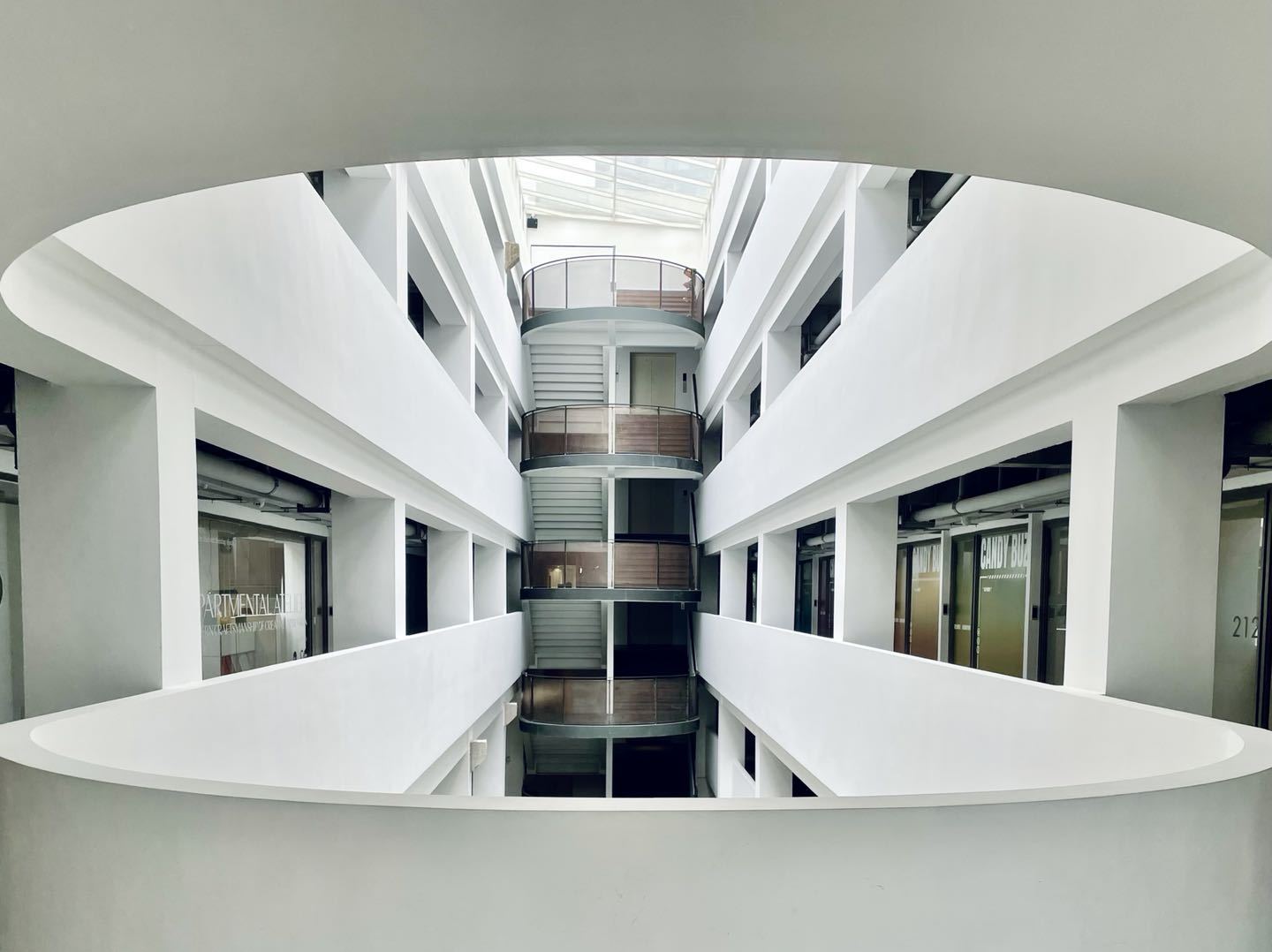 在布局上也极为简单,只由一个中庭以及围绕中庭的环形走道和两侧楼梯构成。旋绕而上的半圆形楼梯和建筑内部各个立面的线条元素独具几何美感,中庭两侧连桥的弧形设计营造出独特的空间质感。