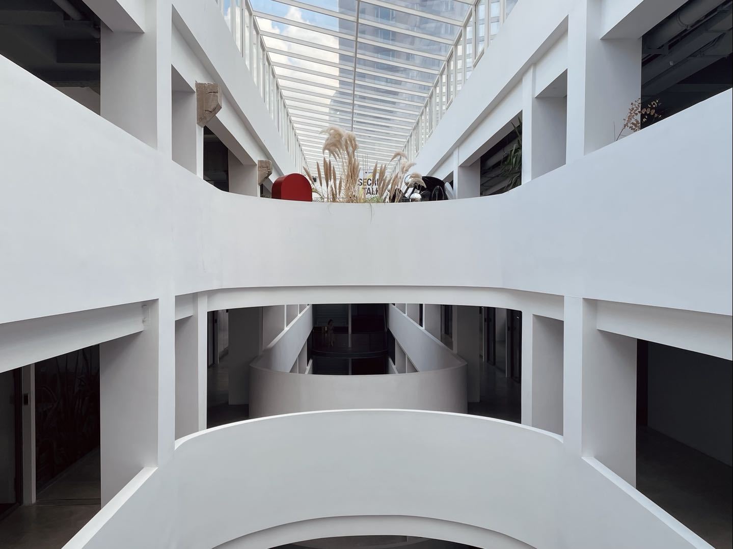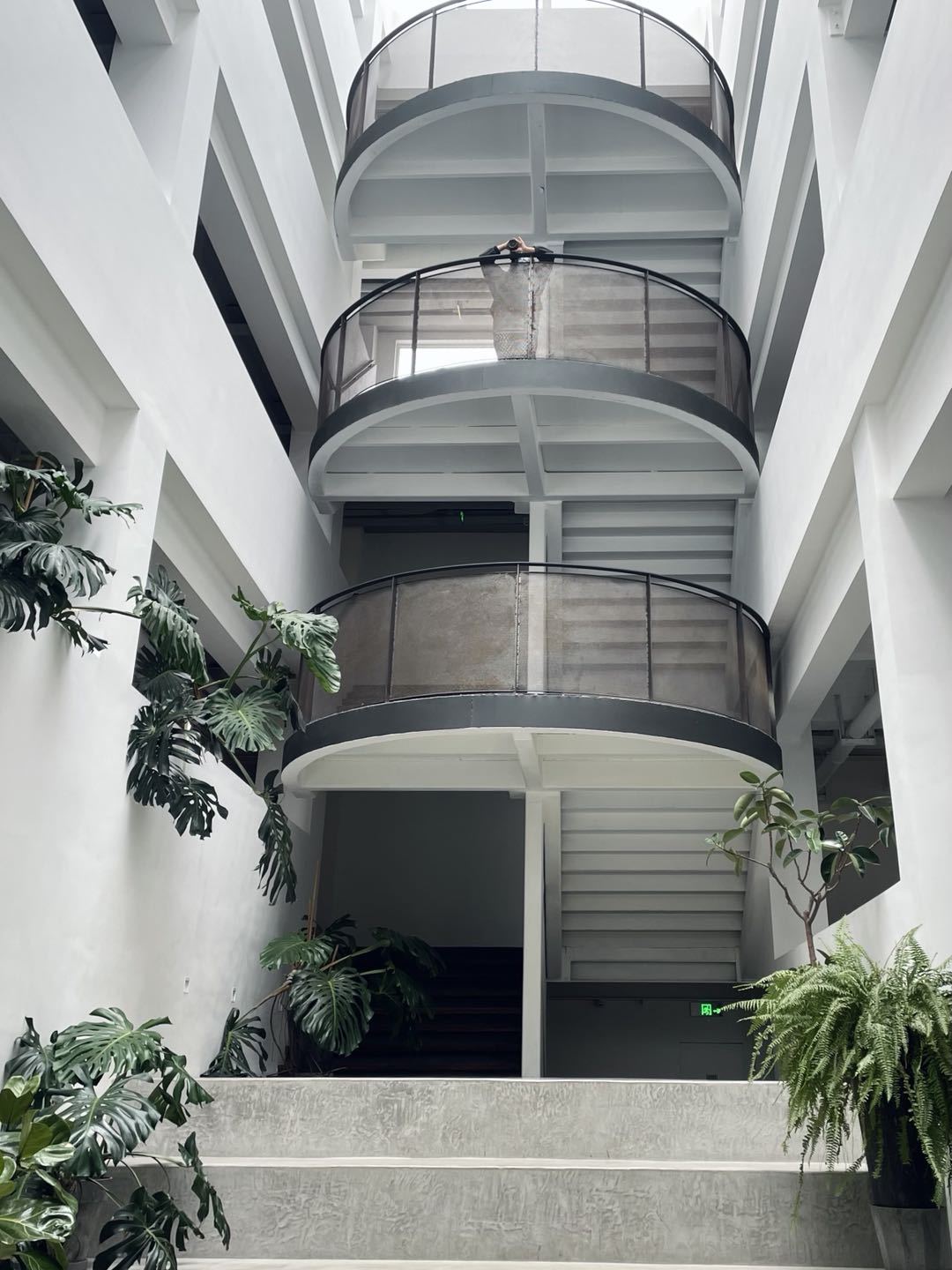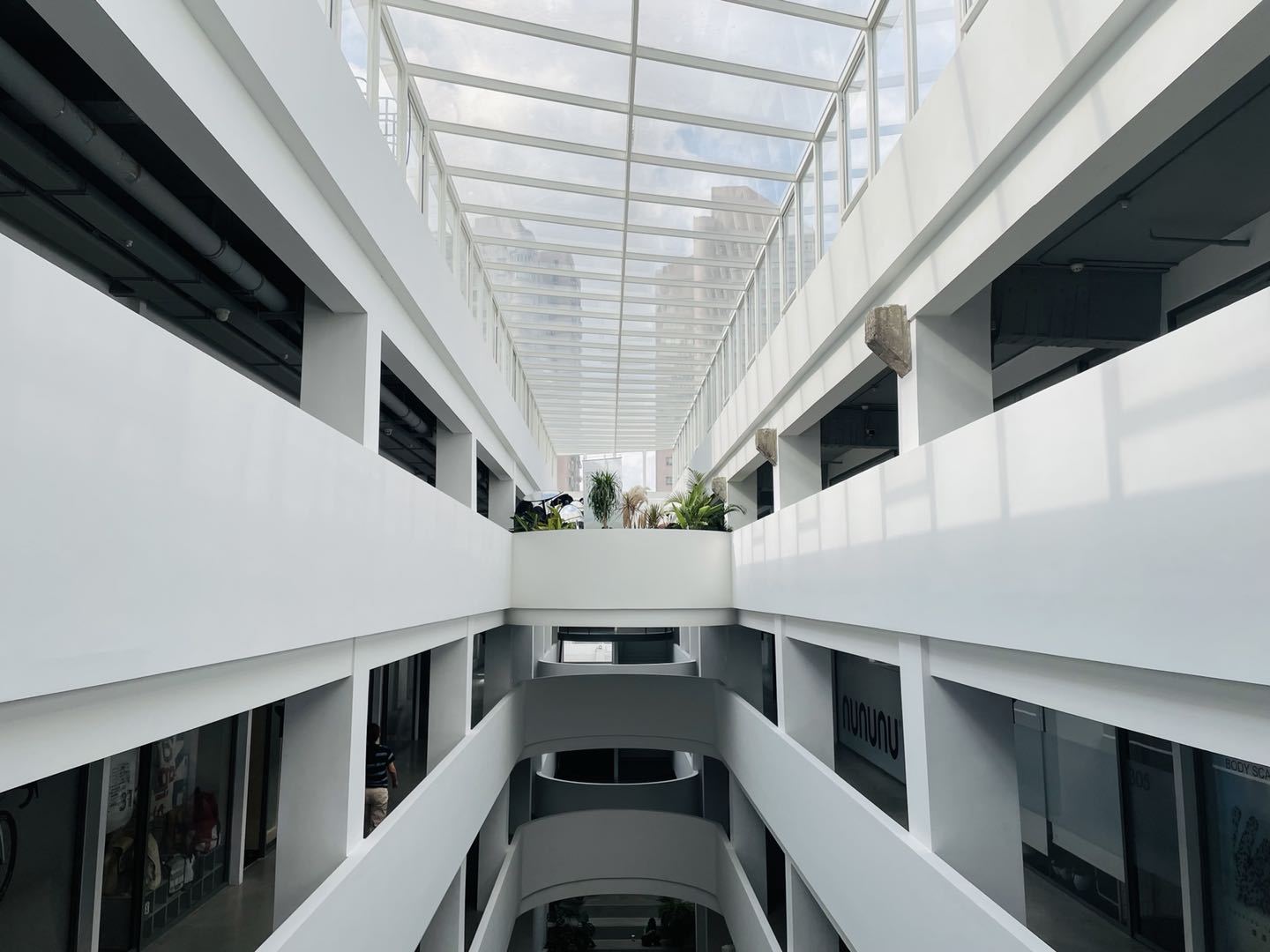 园区设计风格以简约工业风为主,整个建筑墙面全部为白色,线条简洁流畅,金属质感的楼梯工业感十足,整体空间干净温暖且轻盈自然,几乎没有多余的装饰。不同于拥挤严肃的普通写字楼,现所的顶部采用了全景天窗设计,引入大面积自然光线,让整个空间生机勃勃,带来舒适的视觉和心理感受。