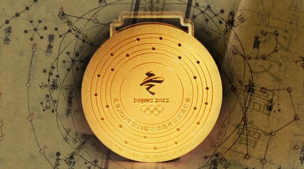 奖牌背面圆环上刻有24个点及运动弧线,取意古代天文图,象征着浩瀚无垠的星空、人与自然的和谐,也象征着第24届冬奥会上运动员如群星璀璨,挥写精彩篇章。