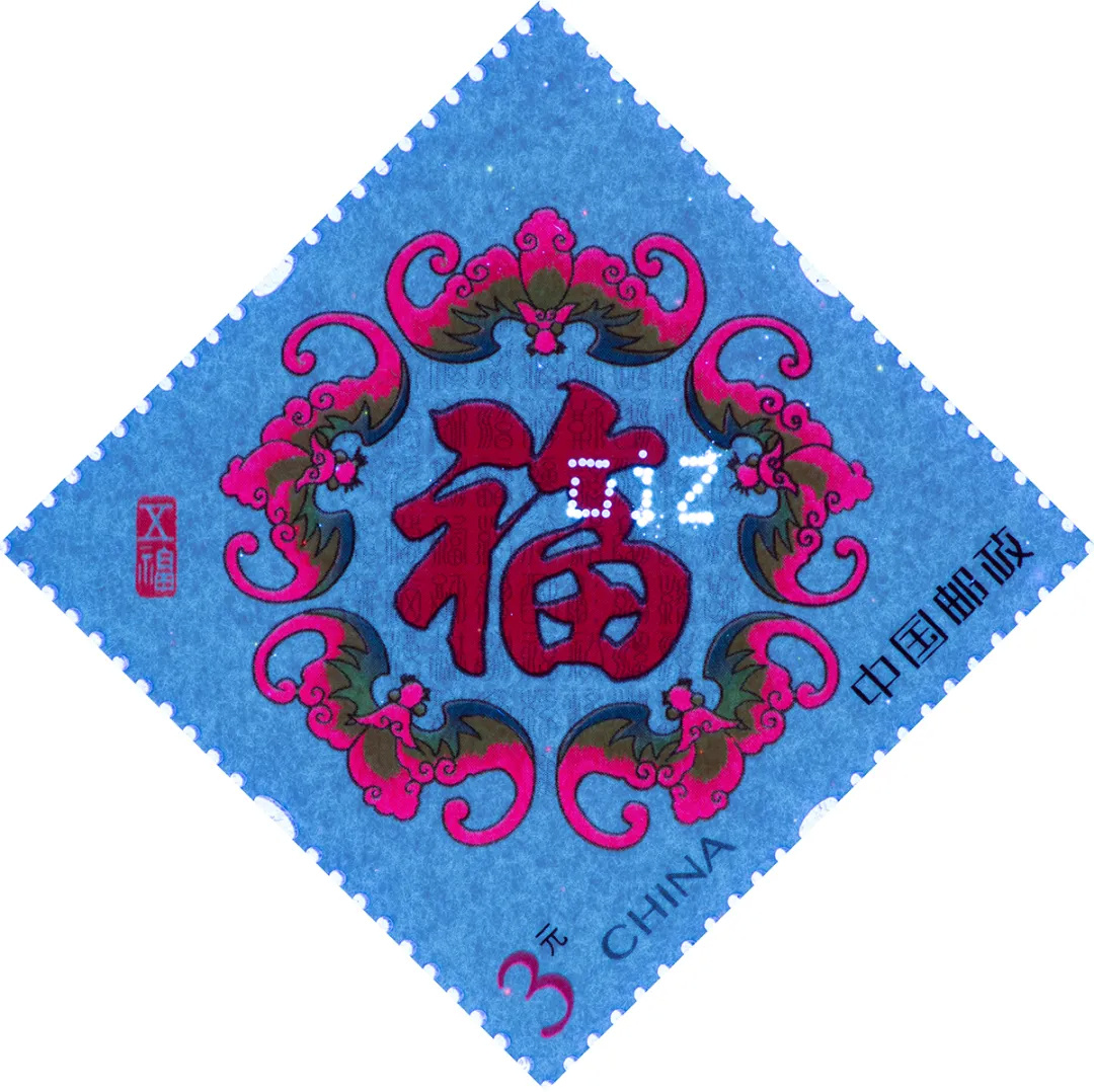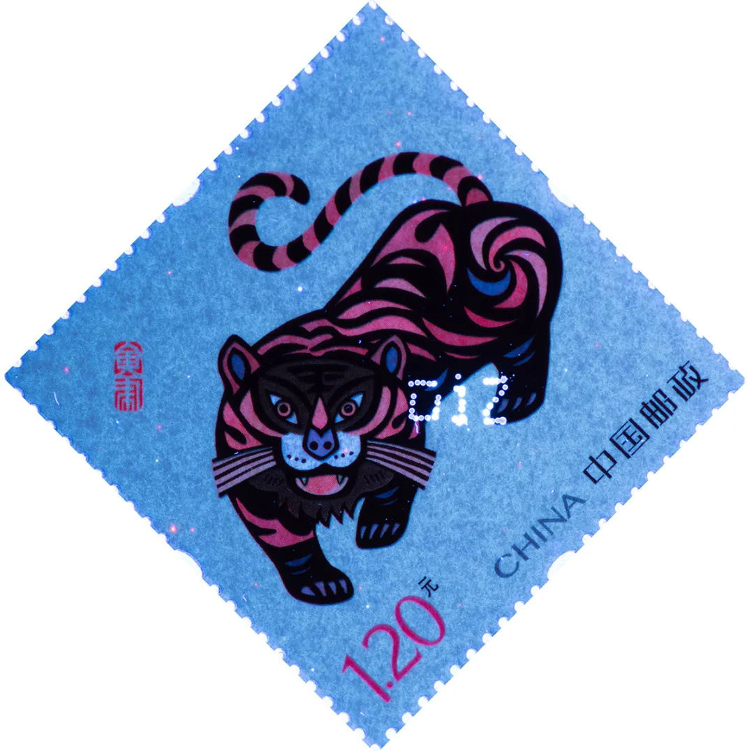 《壬寅大吉》邮票“虎”面部图案采用专金印刷提升质感,虎身条纹色彩饱和、层次丰富。《五福临门》邮票使用专金油墨对“福”字、“五蝠”图案进行边缘描绘,突出设计主旨;同时采用无色红荧光油墨工艺使邮票图案在紫光灯下呈现亮丽红色,烘托出浓郁的喜庆气氛。