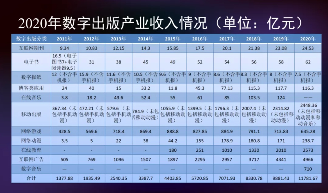2011—2020年数字出版产业收入情况(单位:亿元,表格来自《2020-2021年中国数字出版产业年度报告》)