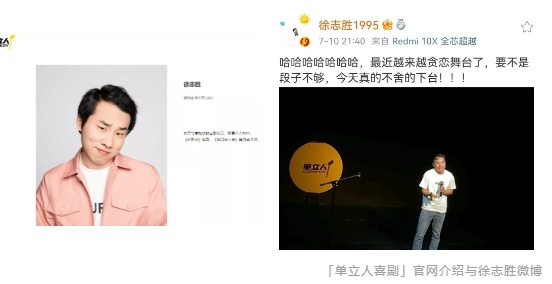 徐志胜就是“养成系”演员:从「单立人喜剧」观众、到现场演出志愿者、再到学员、新演员,最终成为签约演员。联合创始人icy说,2018年徐志胜报名志愿者的邮件是她亲自回复的,知道他看过教材也参与过培训,经过近2年时间的培养后正式签约。