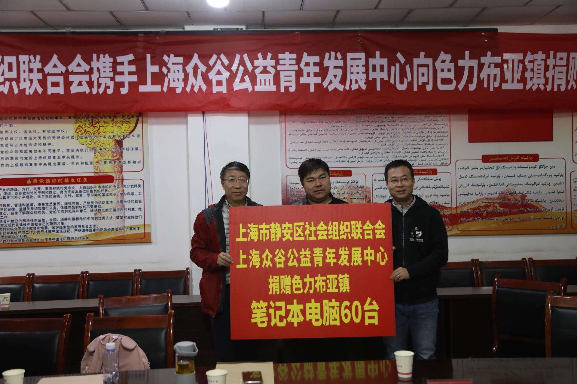 10月24日,在色力布亚镇人民政府举行再生电脑的捐赠仪式,此次上海众谷公益青年发展中心将60台再生电脑赠予色力布亚镇,区社联会会长王希佳、众谷公益党支部书记、理事长张斌峰向色力布亚镇政府进行捐赠,巴楚县政协副主席、色力布亚镇党委副书记、镇长艾克巴尔·依明接受捐赠并主持仪式。