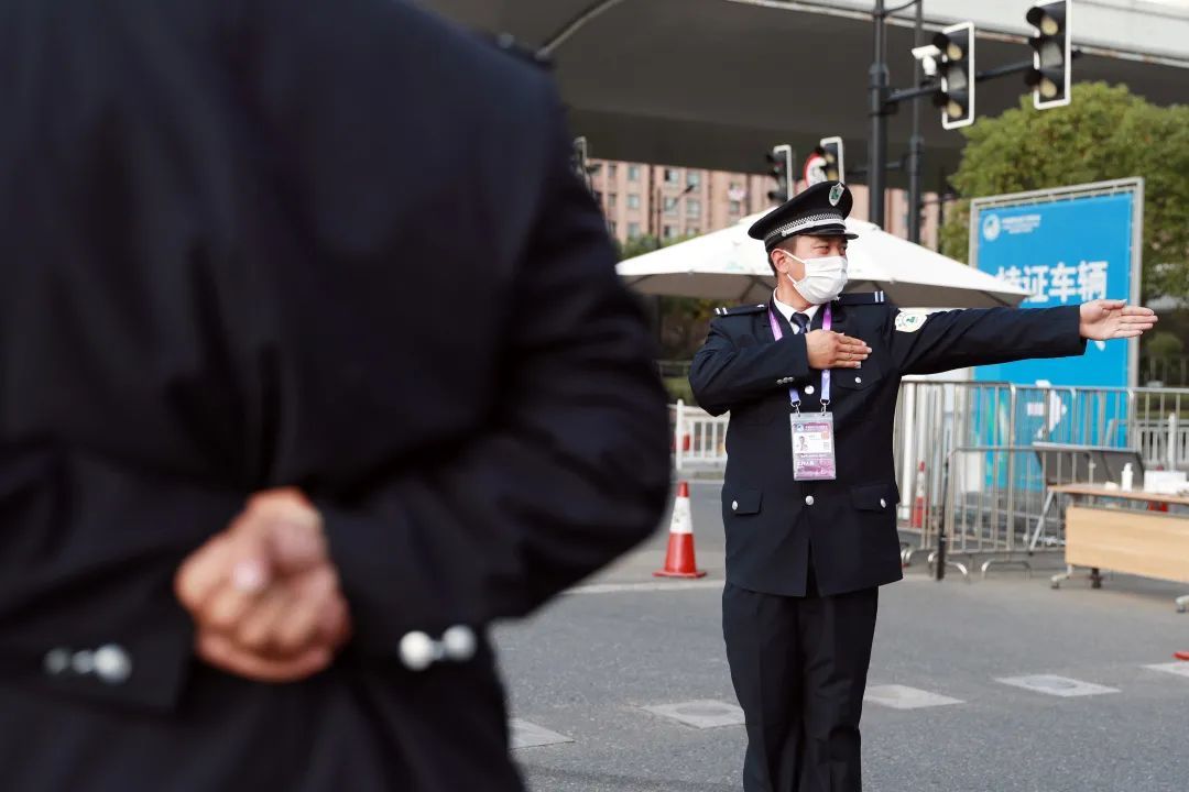 图说丨国家会展中心共有21个大门,每个大门都由物业公司秩序维护部配合上海警方、安保公司对进出车辆及人员进行核查与引导,确保布展工作安全、有序的进行。图为陆家嘴物业秩序维护部的工作人员正在引导持证车辆进入场馆。