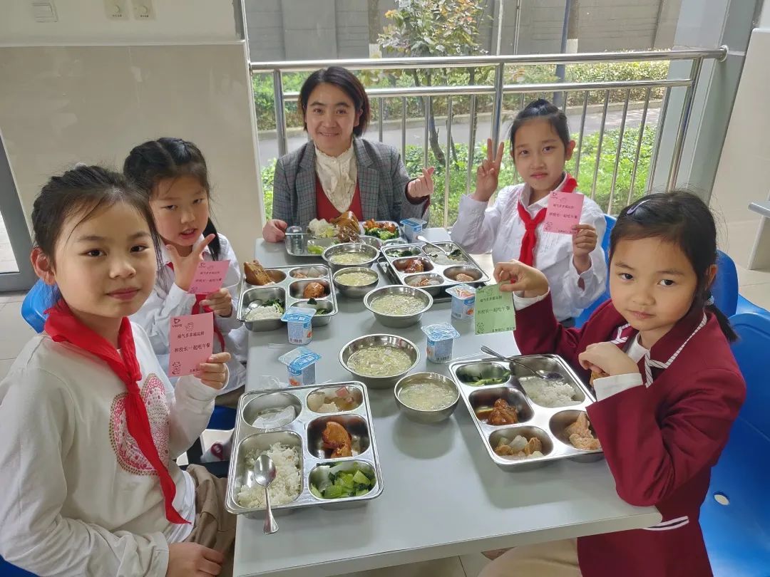 新学期,每位同学从校长手中接过代表祝福的“福袋”,很多同学的“福袋”内容是“和喜欢的老师共进午餐”“和校长一起吃午餐”等,老师和学生一起“光盘”,一起享受午餐的美味,真是太有趣了。学校还有行政管理老师的陪餐制度,家长更放心,师生更融洽。看,同学们吃得多么开心!