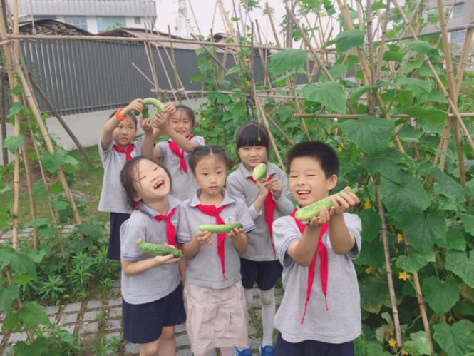 学生在快乐农场里收获自己种下的黄瓜