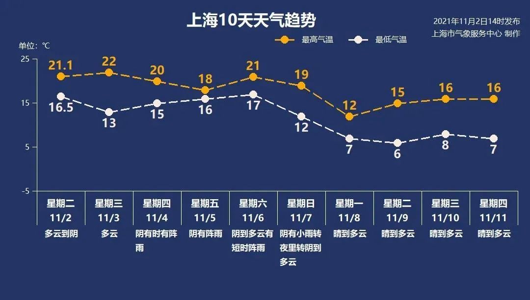 受到江淮气旋的影响,明天(11月4日)白天开始转雨,夜间雨势增强,后天(11月5日)一整天都雨水缠绵,而且雨量不小。气温方面,受冷空气影响,预计本市11月7日下午起气温下降,11月8日起最低气温跌至个位数。