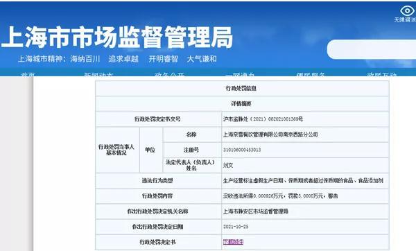 据上海市市场监督管理局网站消息,近日,上海奈雪餐饮管理有限公司南京西路分公司因销售过期蛋糕,被上海静安区市场监督管理局罚款5万元,并没收违法所得9.26元。
