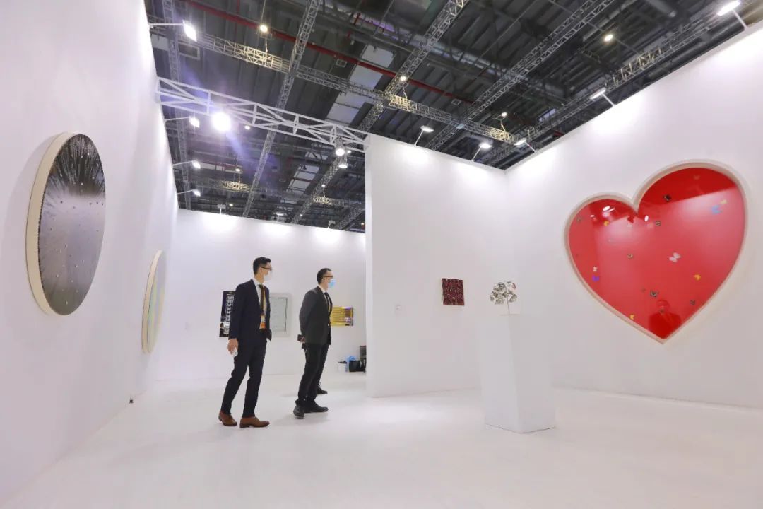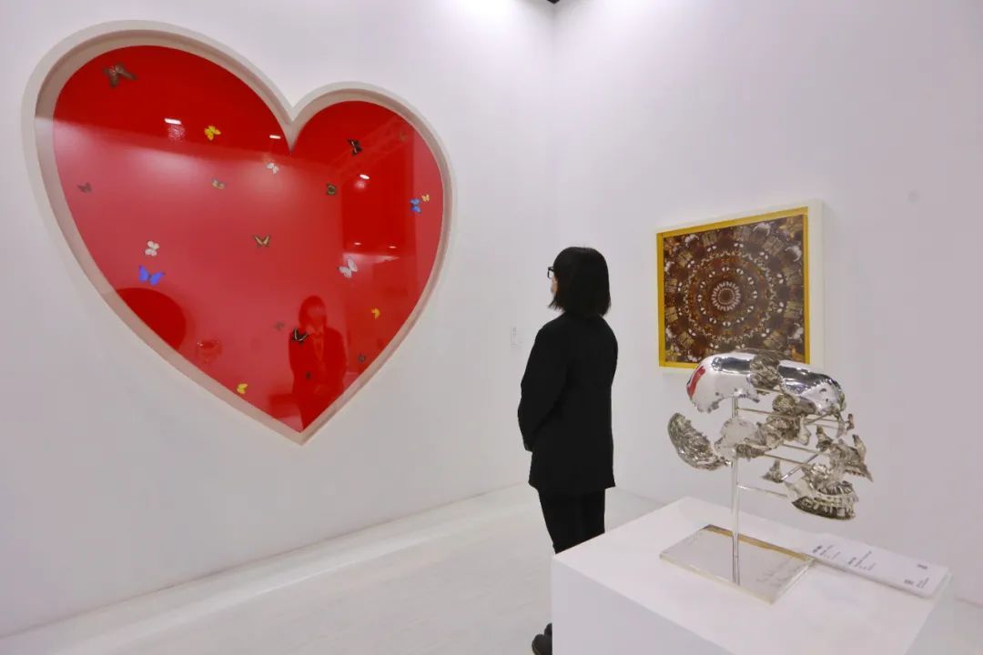 今年首次进入中国市场的heni合旎艺术机构所带来的重量级国际艺术家达明安·赫斯特作品也很“吸睛”,红色的“大鸡心”特别地夺人眼球。