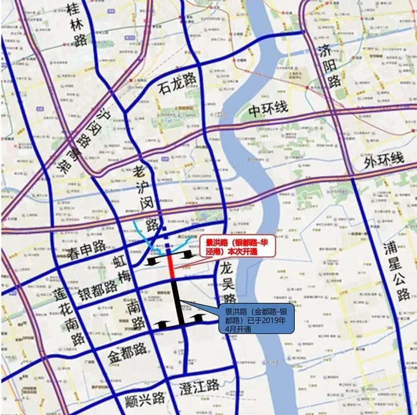 景洪路的辟通,打通了徐汇与闵行之间的交通堵点,明显缓解南北向交通压力,能更好完善闵行区对外的交通体系,春申塘两岸华泾镇和梅陇镇居民出行又多了一种选择。春申塘南岸的梅陇镇居民前往华泾西站乘坐轨交15号线更加方便。