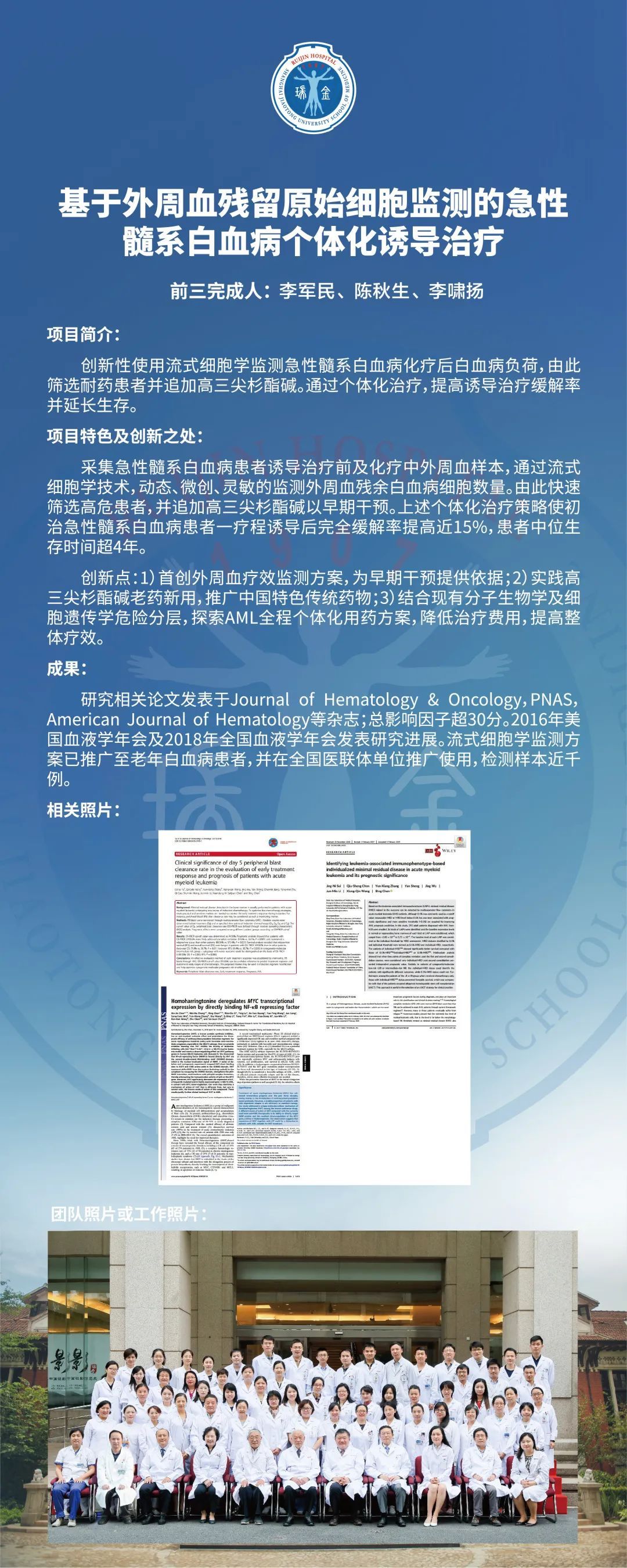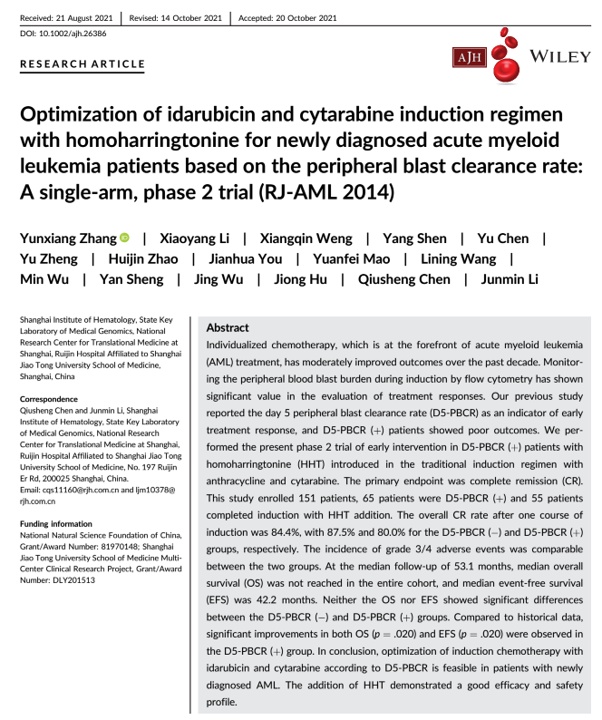 高三尖杉酯碱联合传统ia方案的临床研究结果已经发表于american journal of hematology。目前,研究小组在前期成果基础上,将白血病的分子分型结果与d5-pbcr相结合,设计了一套更精准化的诱导治疗方案。根据患者不同分子结果及诱导治疗反应,追加更有针对性的靶向药物联合传统化疗,期望能在将来继续提高aml患者的疗效。