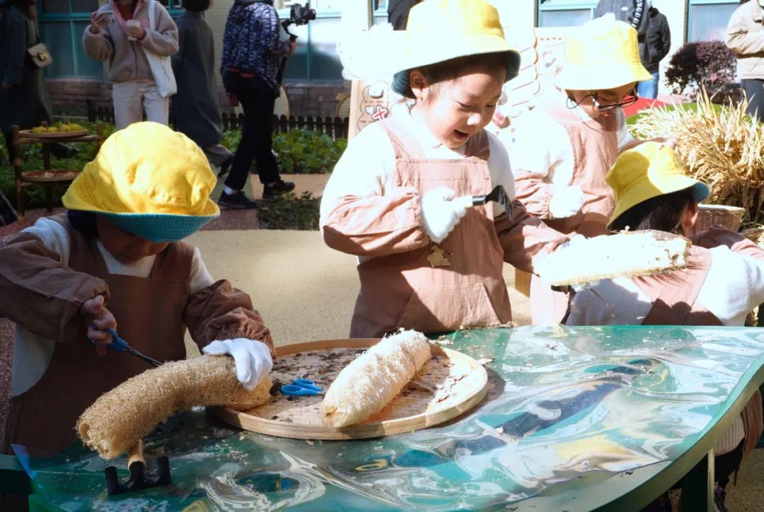 小张导带大家参观了“健康种植园”,园内孩子们正在捻麦子、拔萝卜、挖红薯,享受着播种和收获的快乐!