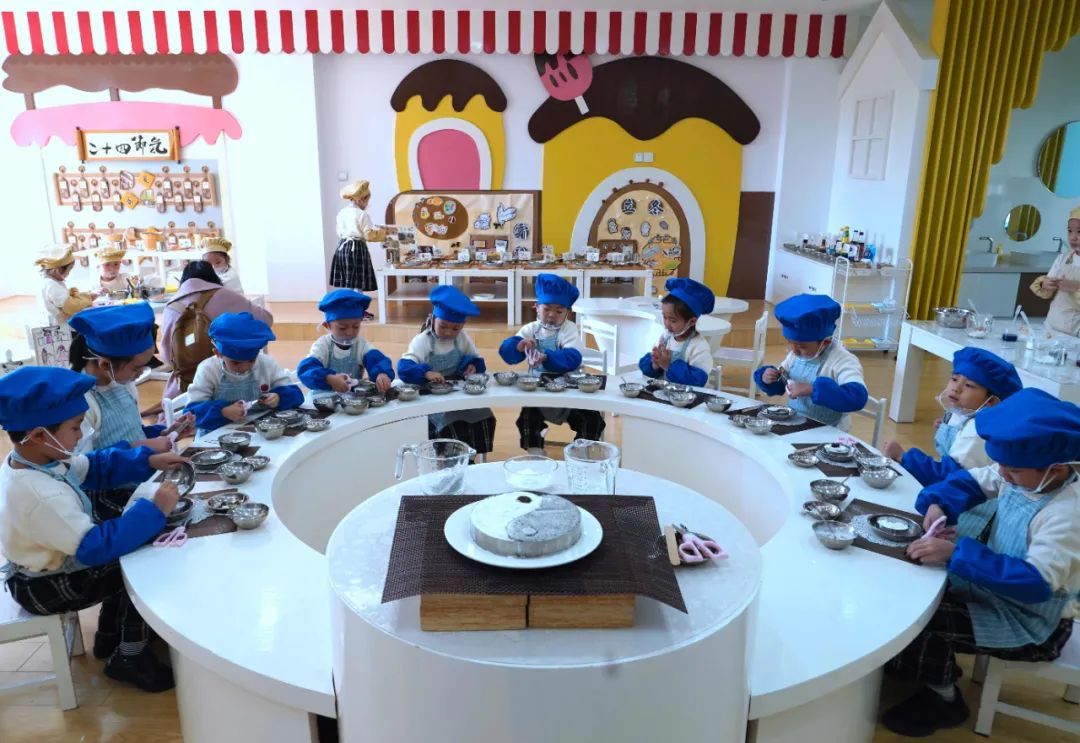 在上海市实验幼儿园的“宝宝料理室”里,营养员叔叔正和孩子们一起制作适合“立冬”食用的“八卦糕”和“五彩饺子”,不同时令幼儿园会按需调配营养粥,让孩子们通过“舌尖上的味道”体悟中国传统饮食文化。