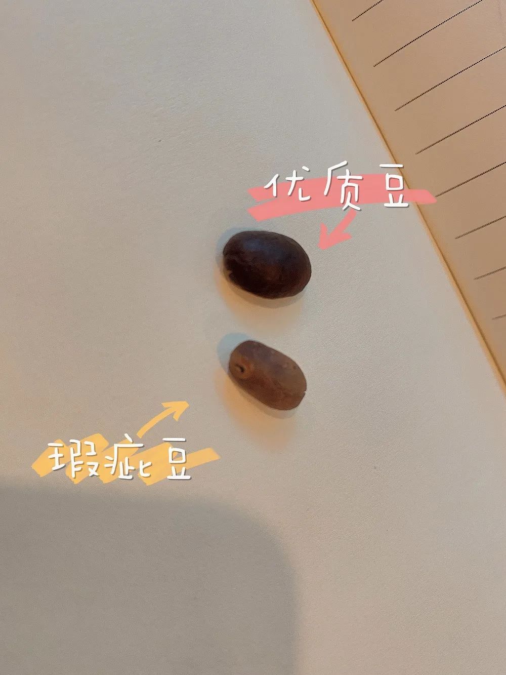 好的咖啡豆豆形完整、色泽光亮、个头饱满,而瑕疵豆就“比较丑”,比如碎裂豆、蛀虫豆、未熟豆等。