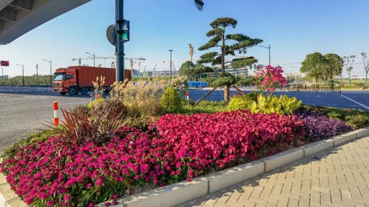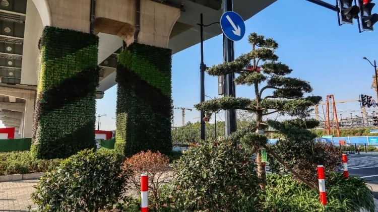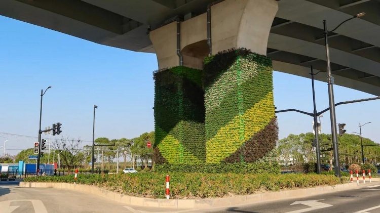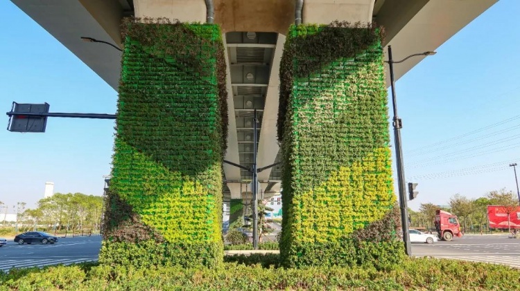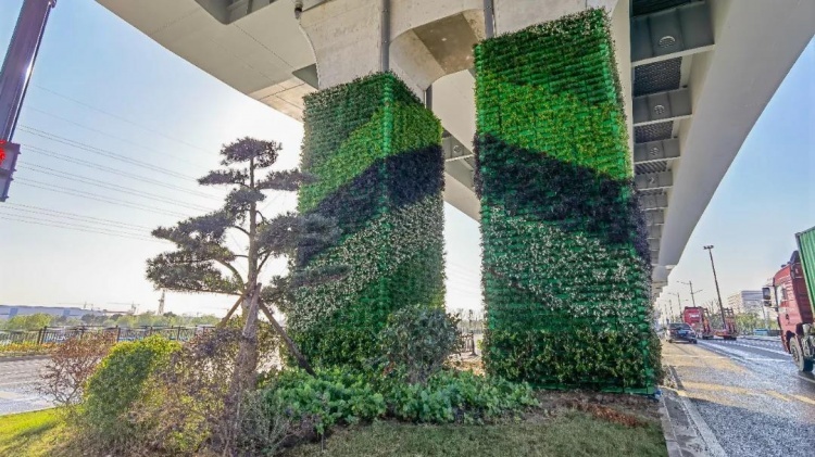 临港新片区管委会说,近日,在两港大道与新元南路交叉口处,一个个桥墩披着“绿衣”形成一道独特的风景线,这是两港大道中段快速化景观提升工程施工后的场景。据了解,此工程包括两港大道中段7个路口,涵盖572个普通柱体绿化和28个高级柱体绿化,目前已全部完成共计16740平方米桥下绿化。详见↓