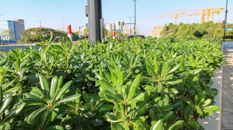路口的高级柱体绿化,选择的植物是花叶络石、满天星、金森女贞、红花继木和亮金女贞,这五种植物对阳光要求不是很高,在背阴的桥梁下也能很好生长,且一年四季常青,美化效果非常好。此次路口绿化景观提升采用“v字形”种植模式,使其依附或者铺贴于桥墩及其空间结构上,形成空中立体绿化带,营造出四季常绿的景观效果。