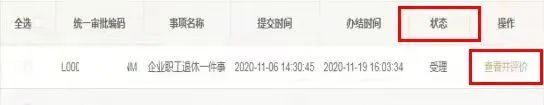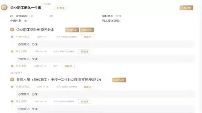 点击“查看并评价”后,我看到 “企业职工到龄申请养老金”和“参保人员(单位职工)申领一次性计划生育奖励费(新办)”已办理完成,“企业退休职工办理退休医保待遇(新办)”显示“受理”。那为什么整体的办理进度还是显示“受理”呢?