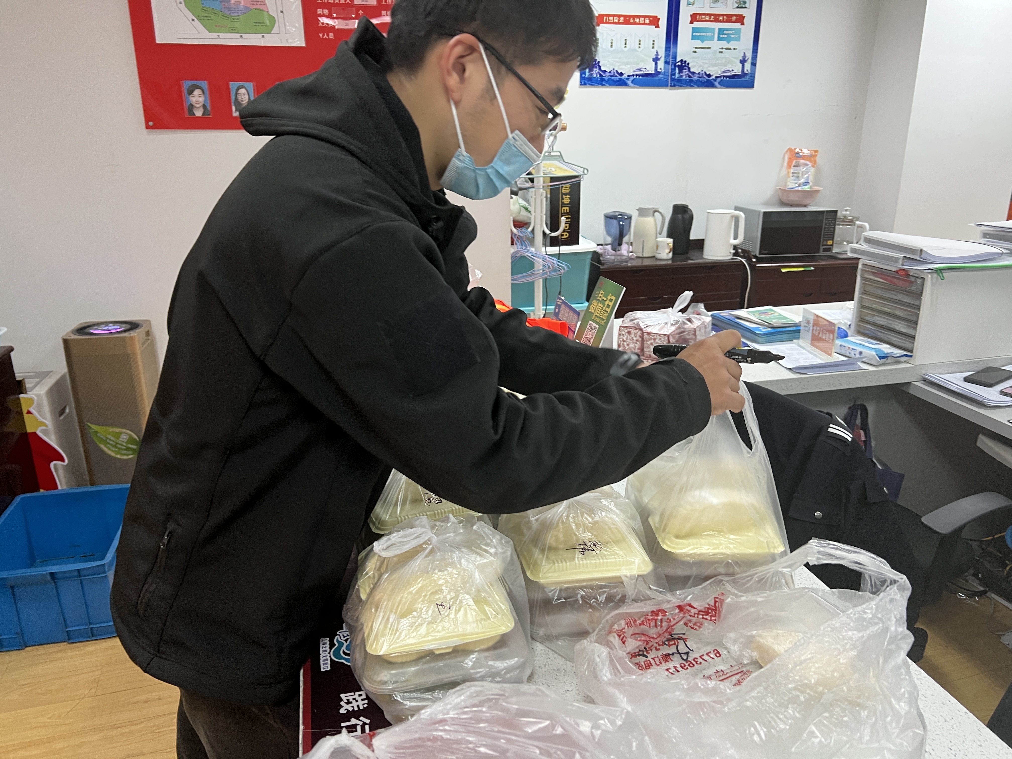 11时10分,送完餐的王晓晶回到了居委会,脱去厚衣后的他从冰箱里拿出一个巴掌大的饭盒,里面装着分量不多的两样菜。在等待微波炉加热时,他拿出记录的纸条和剩下的喜糖交给同事并说道:“这几户老人不在家,糖没有送出去,下次再给他们吧。”“晓晶,你人高马大的就吃这点,跑上跑下又费力,快试试我这个菜,给你加点餐……”同事们用行动表达着对王晓晶承担小区助老送餐工作的认可。