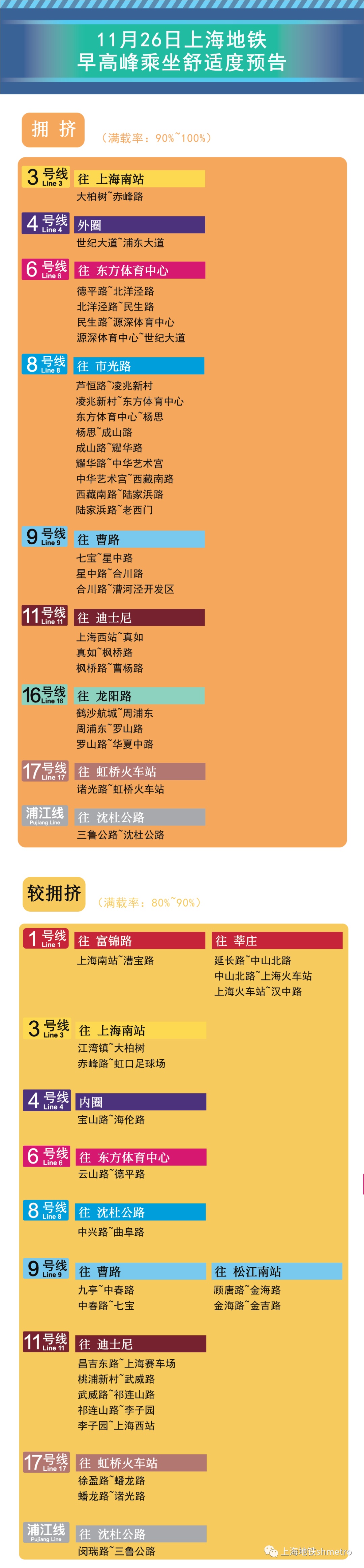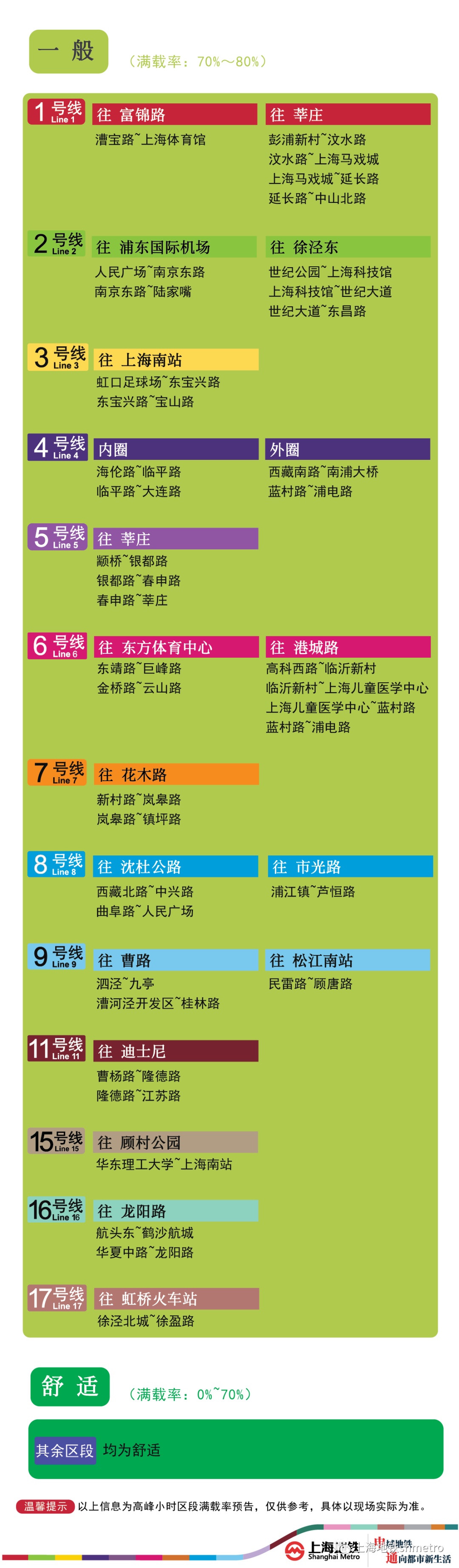为提升上海地铁早高峰期间出行服务水平,提升乘客乘坐体验,上海地铁向乘客提供乘坐舒适度预告,方便乘客提前做好出行准备。