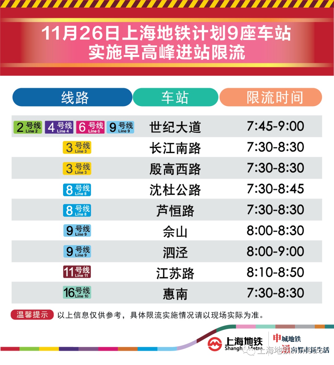 11月26日,上海地铁早高峰限流措施仍将继续,届时将有9座地铁站早高峰计划限流。