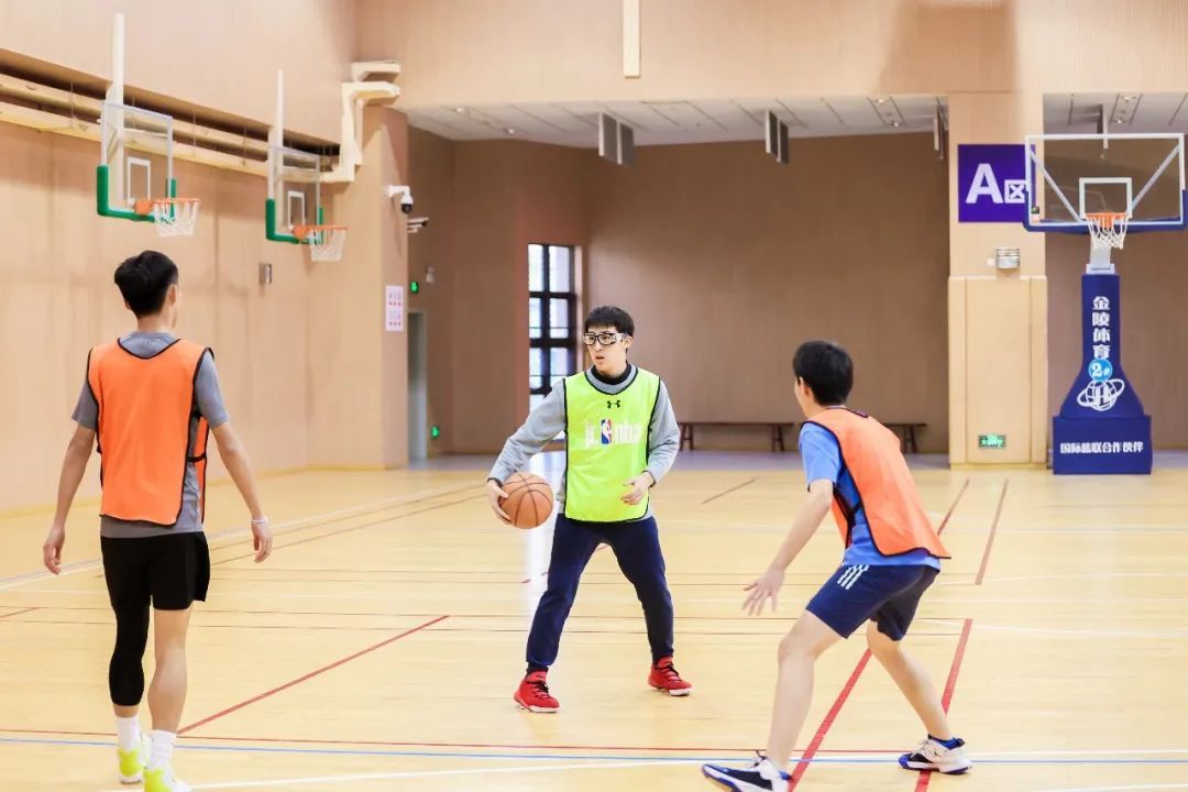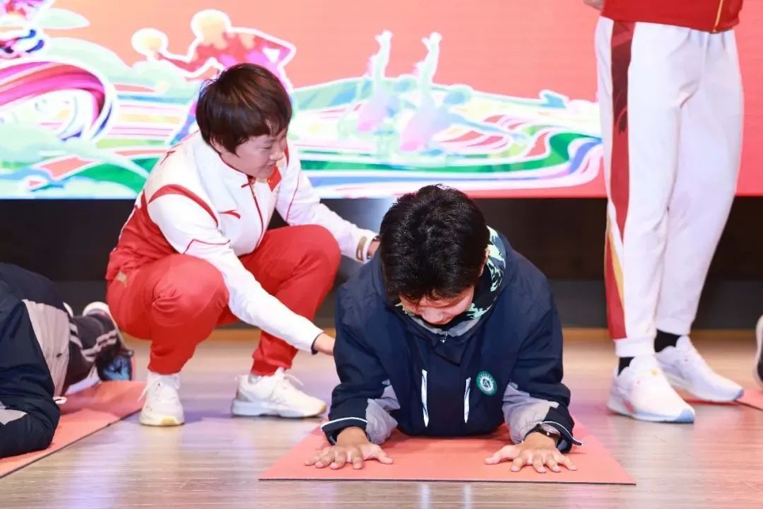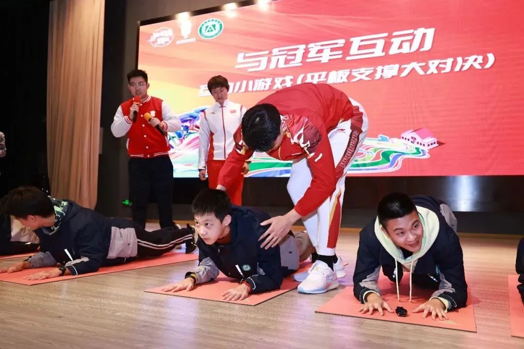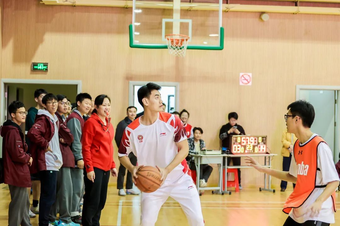 问答互动结束,随之展开的平板支撑大对决点燃了同学们的热情,钟天使和颜鹏亲自上场进行指导,纠正同学们的错误动作并作为裁判选出优胜同学。而在此后进行的3v3篮球比赛中,颜鹏更是作为“教练”在场边对两支队伍进行了现场指导,并在最后一分钟加入落后队伍与同学们同场竞技,这也将现场气氛推向了高潮。