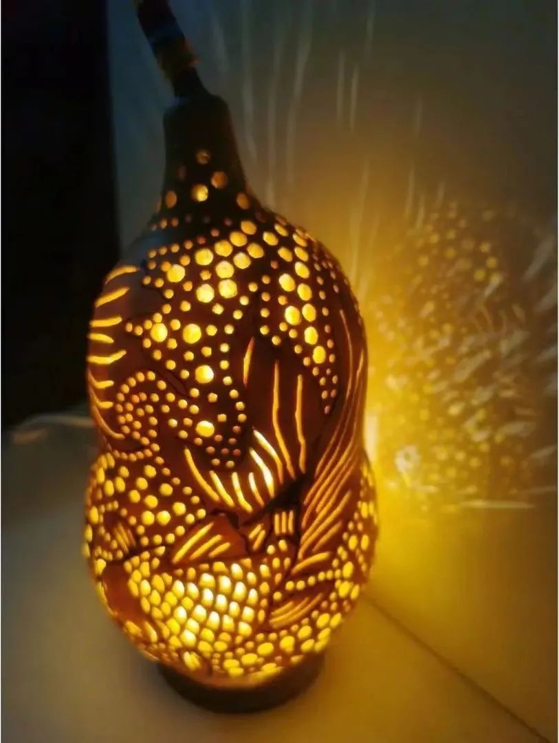 在葫芦雕刻的基础上,设计者进行创新,制作出了既有装饰效果,又有实用照明的“葫芦雕刻灯饰”。