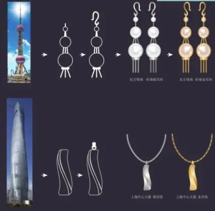 从上海最具代表性地标建筑入手,结合传统工艺,由东方明珠、上海中心大厦两座建筑形式变化而成。