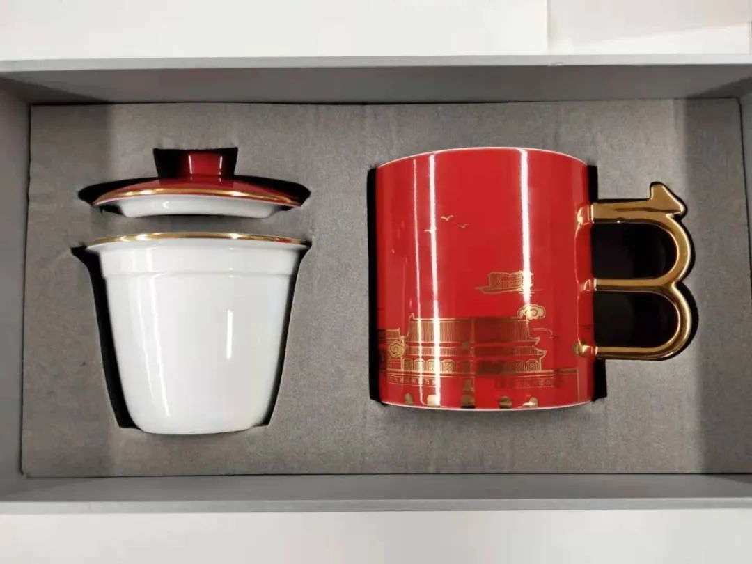 该款咖啡杯碟套装传递了匠人“完美无缺” 的美意,其纹饰源自上海博物馆馆藏的釉里红花卉纹菱口杯托和大都会艺术博物馆馆藏的马约里卡陶盘。