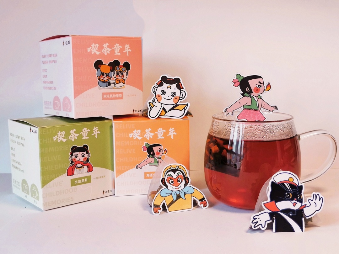 “喫茶童年”是以上海美术电影厂的六个经典故事为灵感,结合上海的海派茶文化做的袋泡茶礼品设计。整套设计选择了大闹天宫、天书奇谭、葫芦兄弟、黑猫警长、舒克贝塔、哪吒闹海这六个故事中的代表人物,与中国茶文化中的几种茶叶融合创新,进行二次创作。