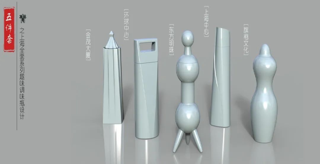 设计灵感来源上海代表性地标建筑、旗袍文化,并运用设计美学,加以青釉材质表面进行大胆创新与运用,打破现有市场调味瓶概念。