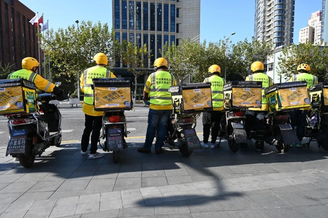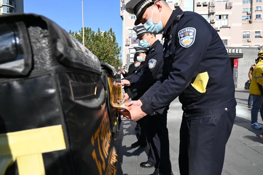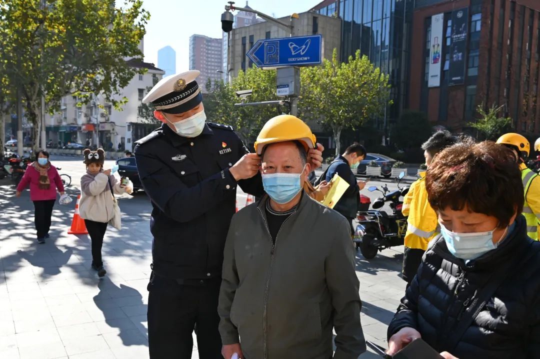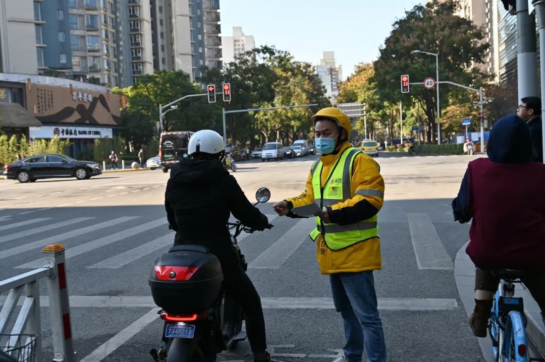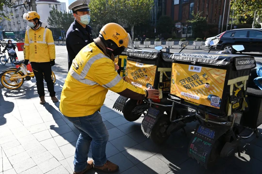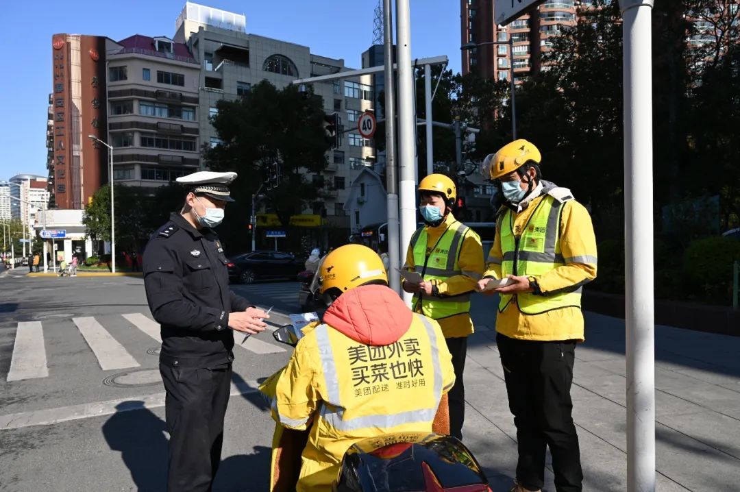 静安公安分局交警支队的民警结合《上海市非机动车管理条例》,重点就电动自行车“礼让斑马线”、正确佩戴安全头盔等方面的内容,向过往市民、外卖小哥展开普法宣讲,提升大家的交通安全出行意识。