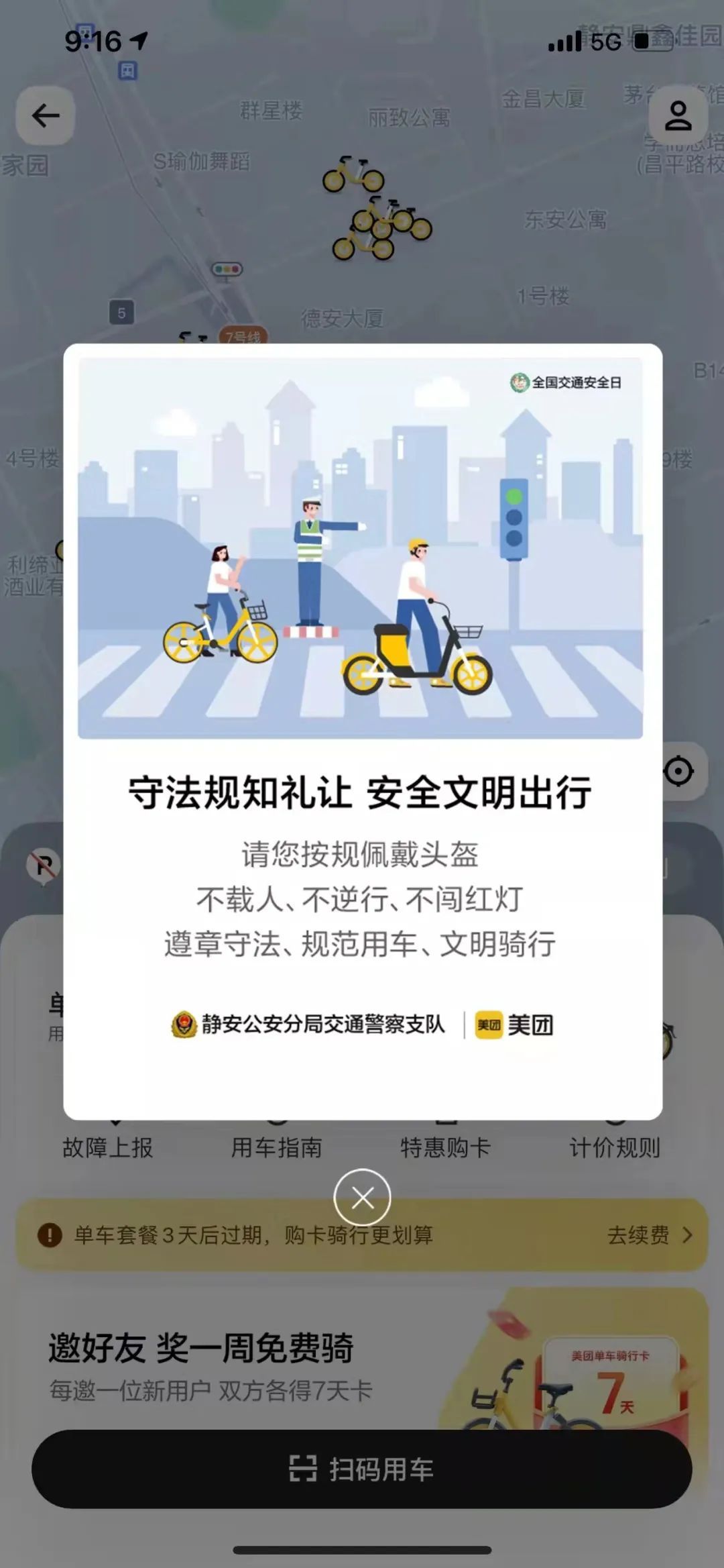 作为静安区开展交通安全宣传的温馨举措,此次交警部门和共享单车企业也开展了进一步合作。最近一段时间,市民扫码共享单车,都可以收到这样的安全提醒——“静安交警提醒您,骑行请遵守交通法规,文明停车。”