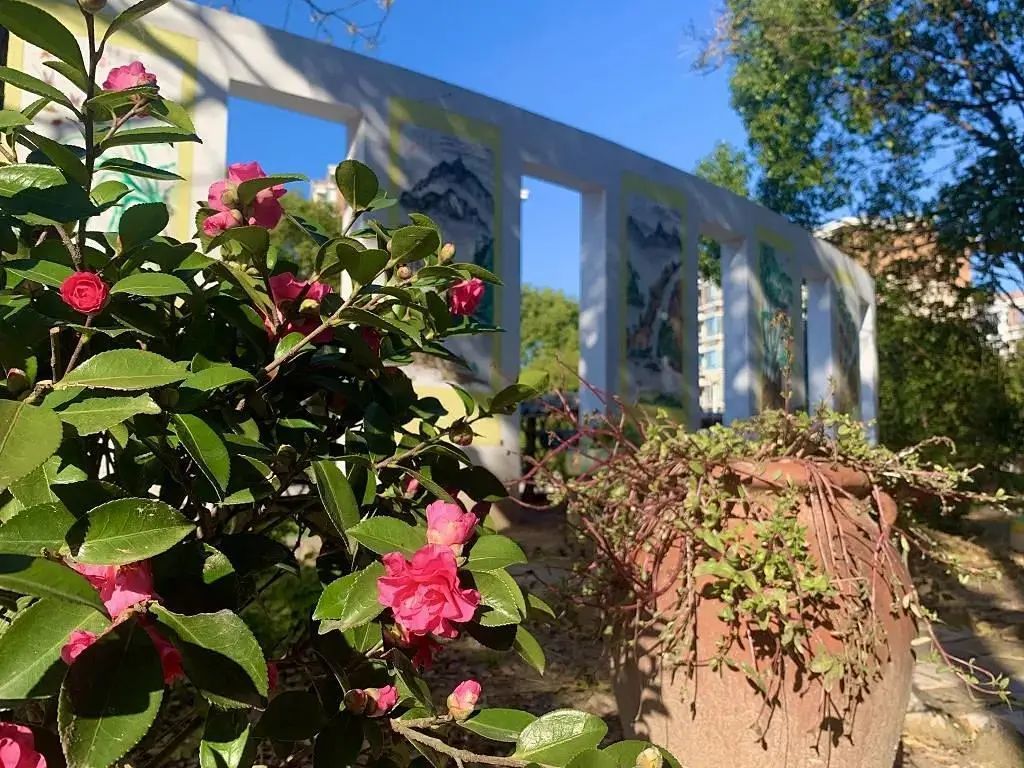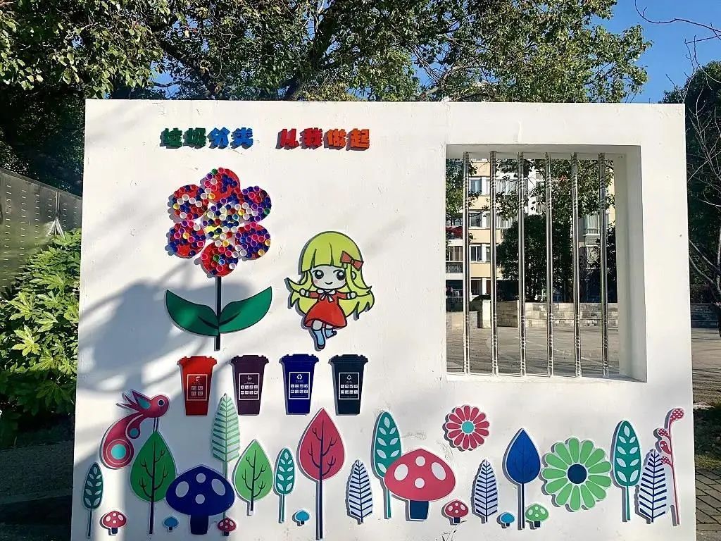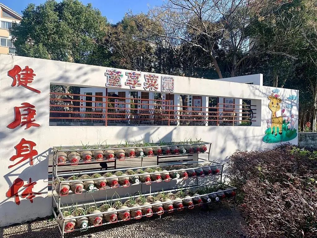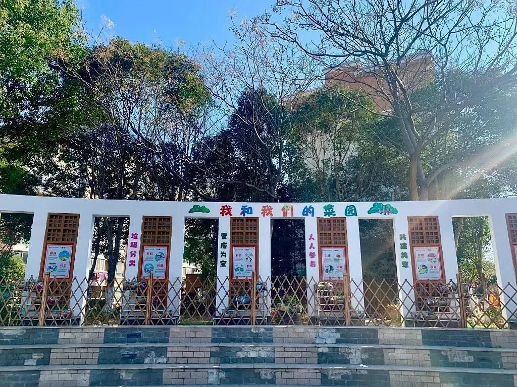 宣传墙后侧修建了一个公共花园,在原绿植基础上种植花卉,并铺设休闲步道,设置休闲椅。休闲步道连通瓶子菜园,方便居民进出。新河镇妇联还在广场南侧围墙下方空地搭建了一个供儿童使用的童享菜园,增设变废为宝宣传墙面,为庭院增添了几分童趣。