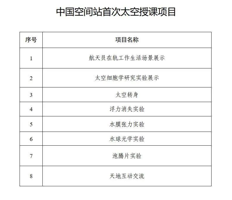 届时3名航天员将在轨介绍展示中国空间站工作生活场景,演示微重力环境下细胞学实验、物体运动、液体表面张力等现象(授课项目附后),并与地面课堂进行实时交流,传播载人航天知识,激发广大青少年对科学的兴趣。