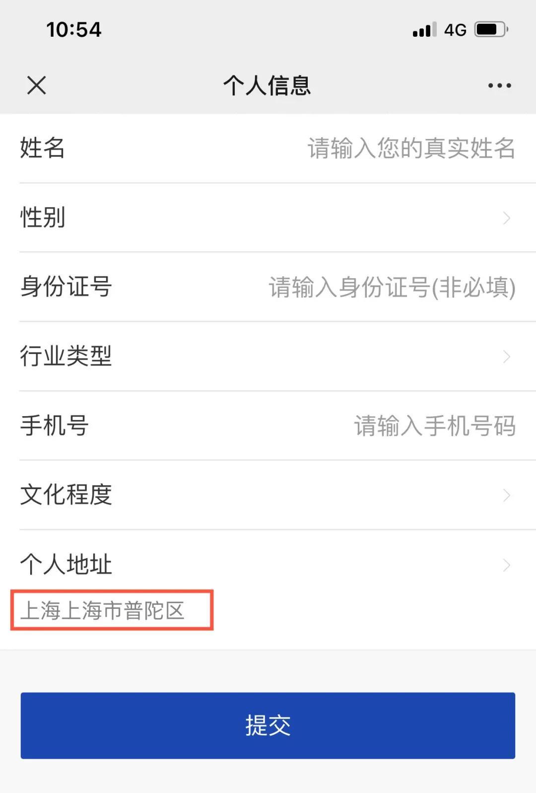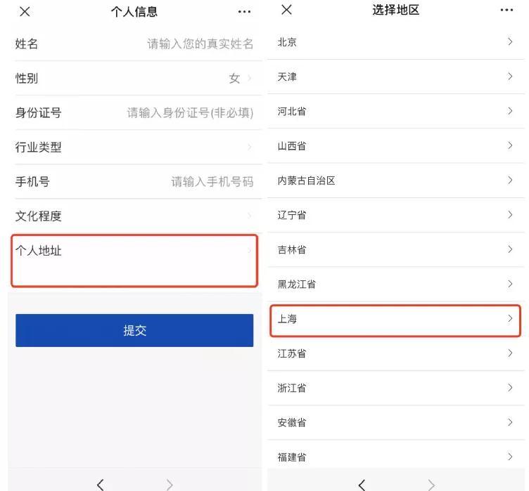 2. 需填写姓名、手机号、个人住址(注:个人住址选择“上海上海市普陀区”)及其他信息,填写完成后点击“提交”完成注册
