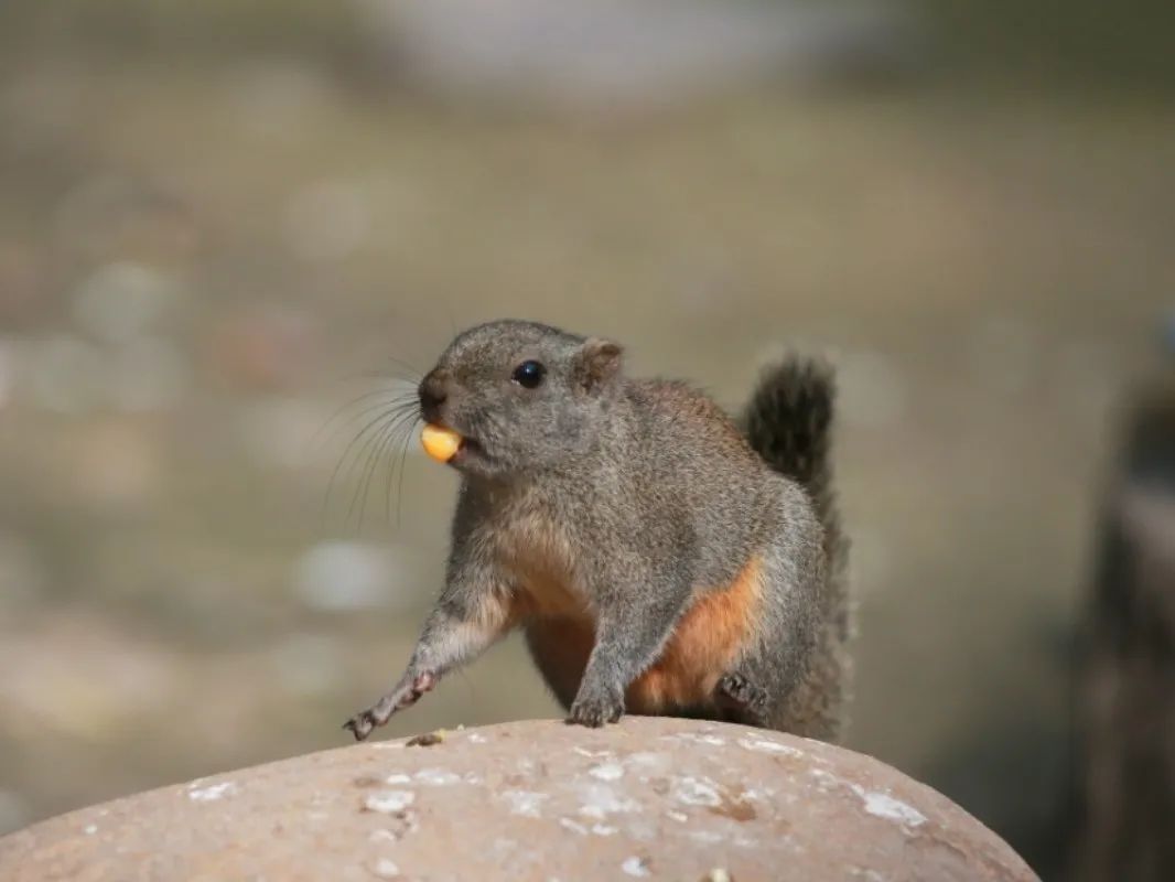 赤腹松鼠乍一看,浑身是不折不扣的老鼠色,颜值全靠软蓬蓬的大尾巴撑着,但要是眼神够好(或者相机够好)的话,可以发现其实它们的肚子是棕红色的,这也是它们名字的由来。