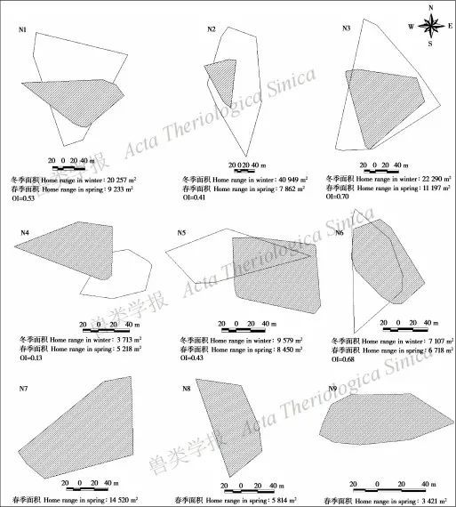 冬季家域面积大于春季,因为冬季食物匮乏,需要扩大搜寻范围,而春季有大量的新生嫩叶和花芽,食物资源多样性提升,家域范围相应缩小。