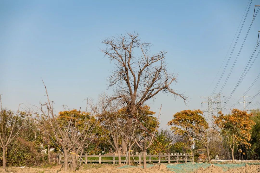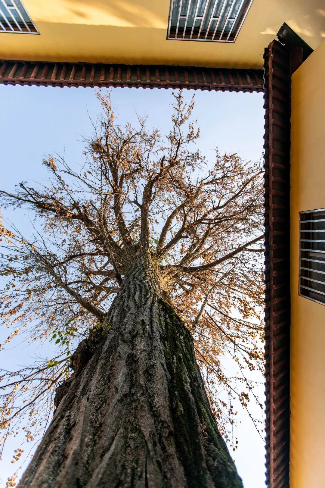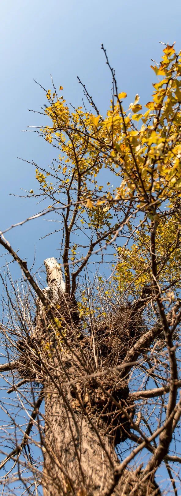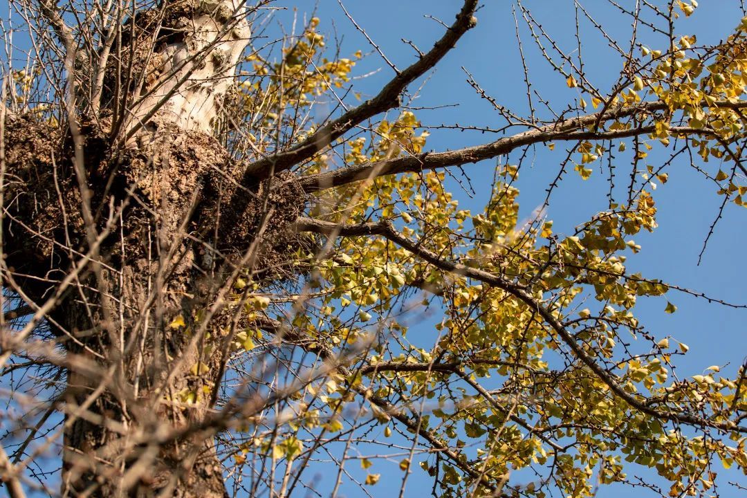 古银杏在蓝天白云之下静谧而优雅,但受此前一波寒潮影响,如今银杏叶已全部掉落,待来年春天孕育新的希望。
