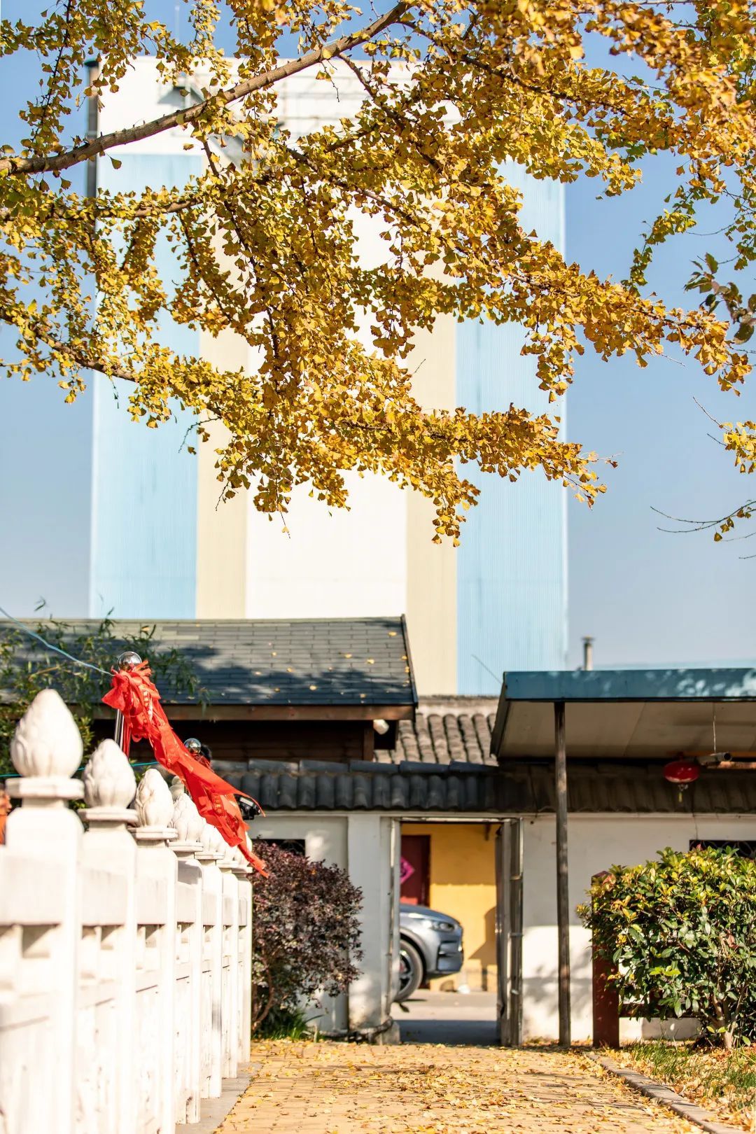 踏着秋色漫步于古树周边,一抬头,阳光在斑驳树影间,徐徐倾斜而下,秋风起、银杏飘,仿佛告别了繁华的都市,静享这一方惬意。