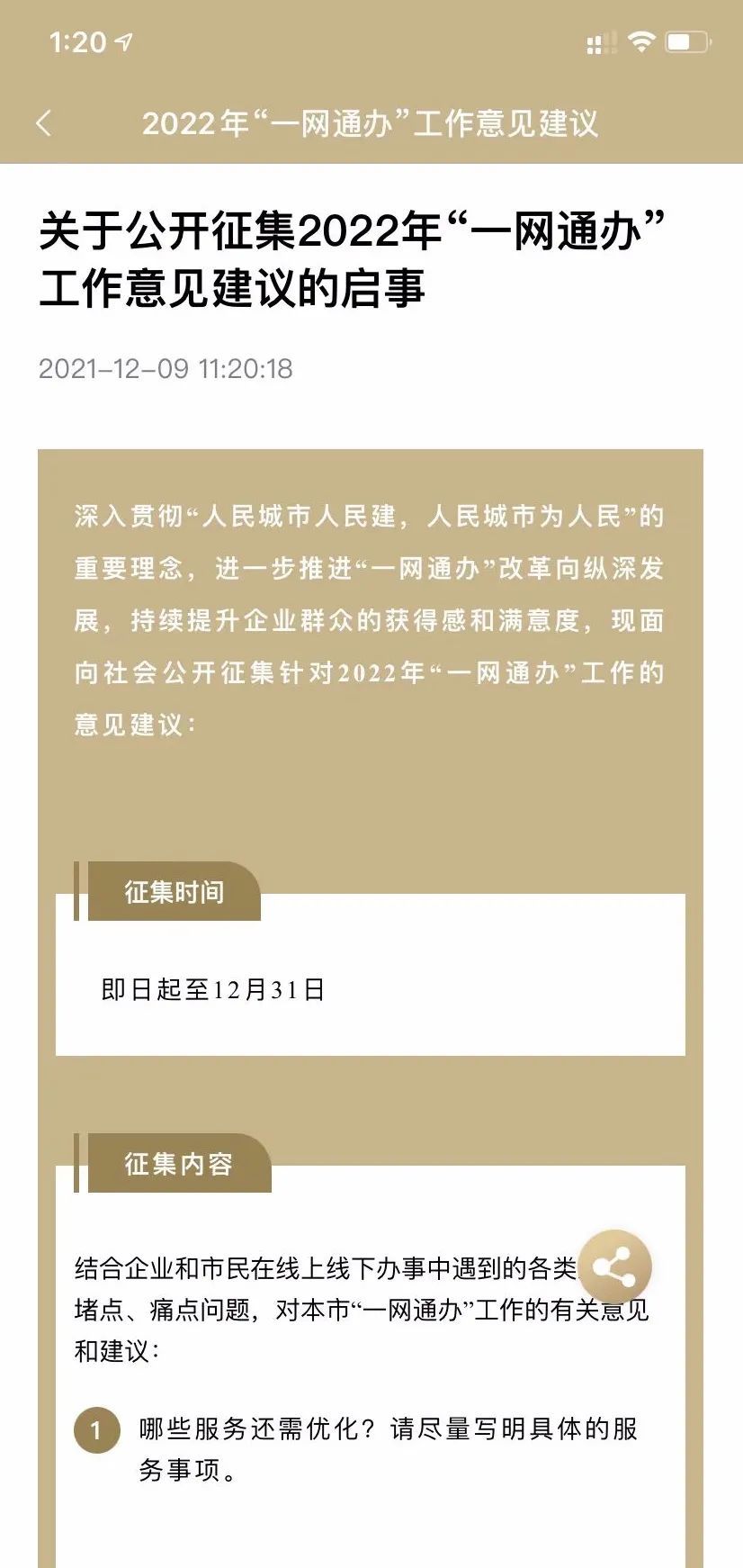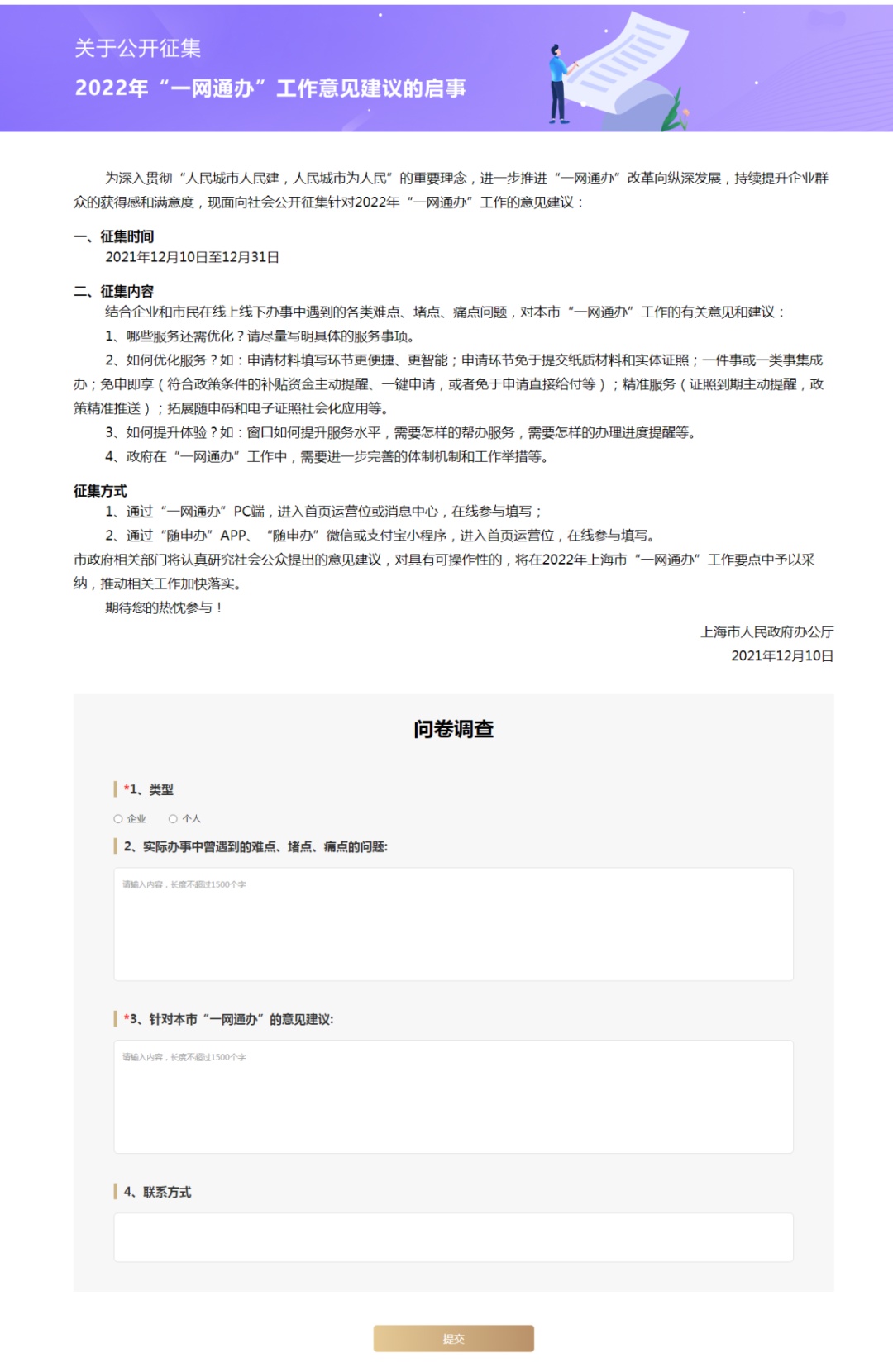 即日起至12月31日,结合企业和市民在线上线下办事中遇到的各类难点、堵点、痛点问题,面向社会公开征集针对2022年“一网通办”工作的意见建议。通过“一网通办”pc端,“随申办”app、“随申办”微信或支付宝小程序,在线参与填写。您的宝贵建议有可能被市政府相关部门采纳落实噢,快来了解下吧!