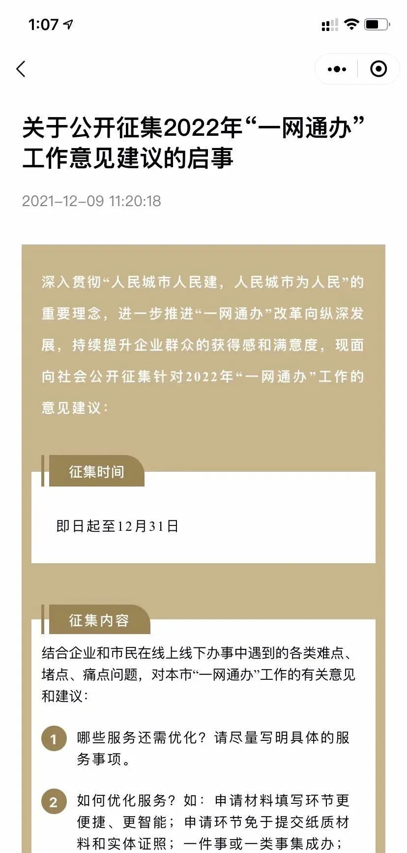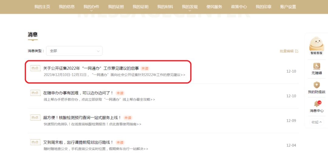 在“消息中心”中找到“关于公开征集2022年‘一网通办’工作意见建议的启事”