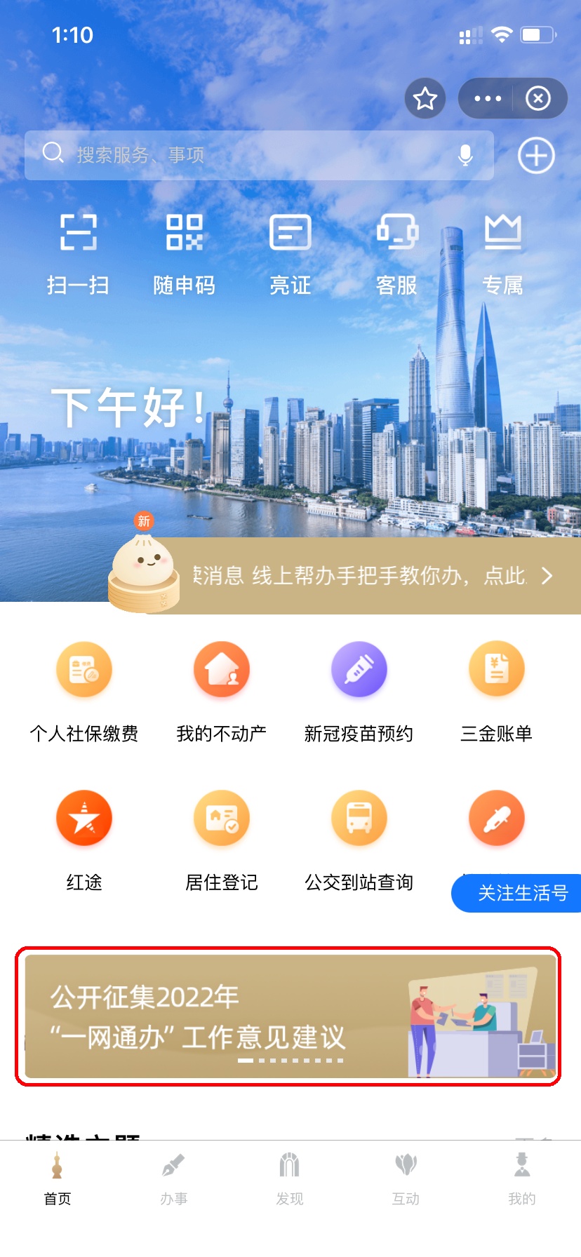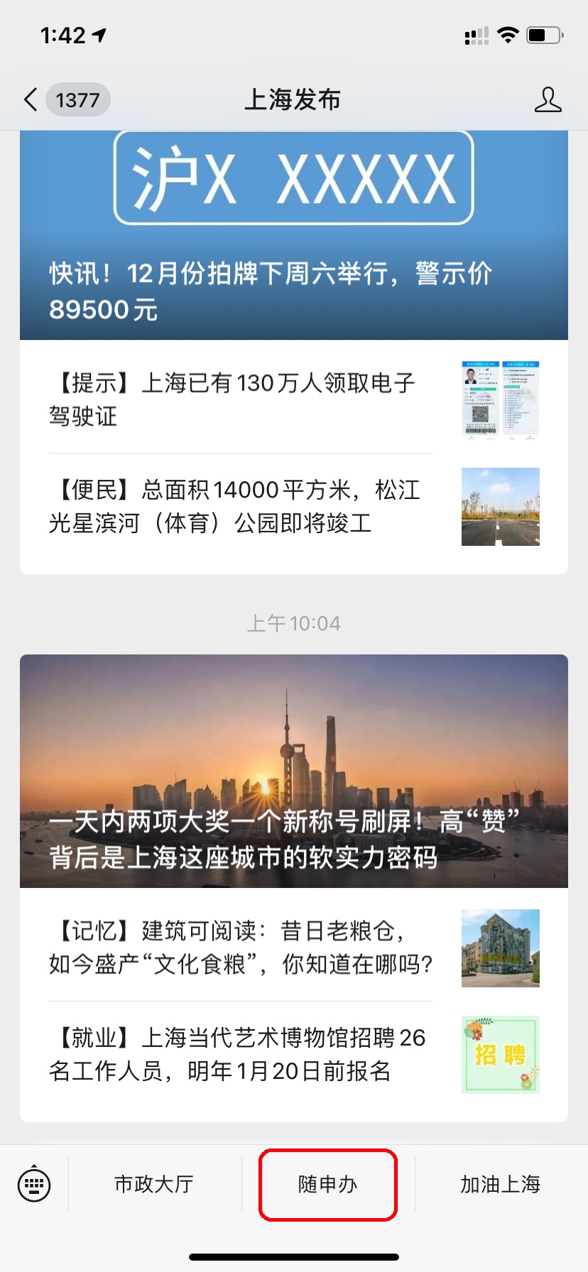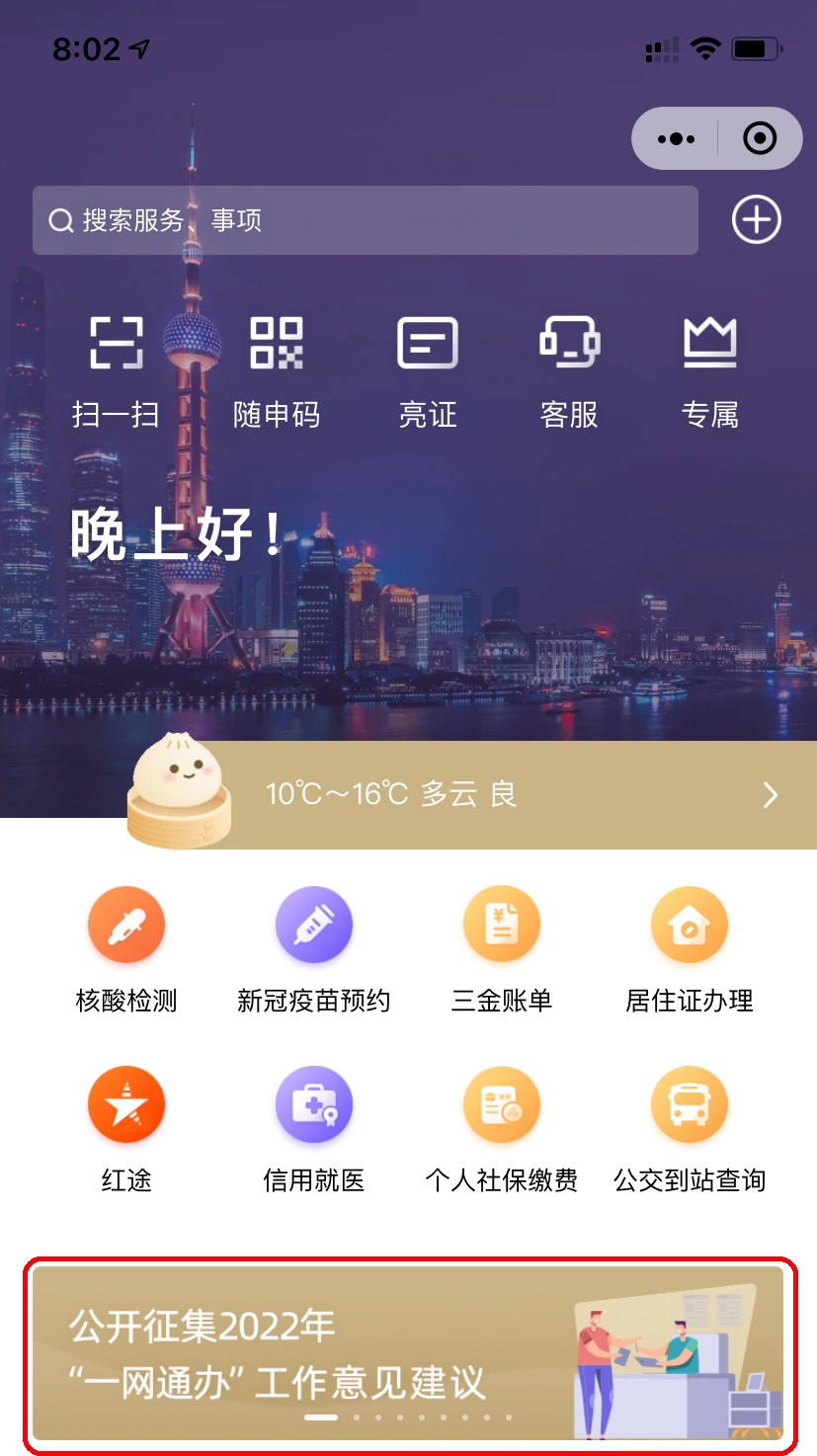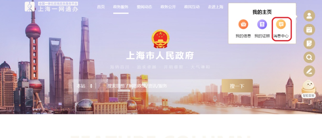 通过“上海发布”微信公众号“随申办”按钮进入“随申办”微信小程序