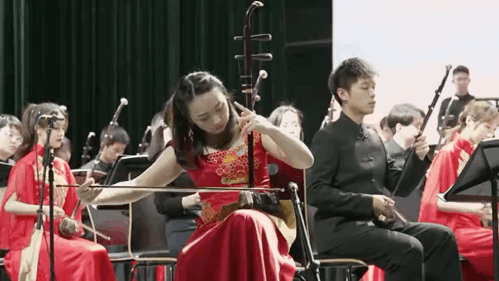 随后,乐团演绎了《唱支山歌给党听》、《长城随想》两首大乐队作品。正值建党百年之际,为契合音乐会主题,我校学生民乐团深情演绎了这首由上海实验歌舞剧院著名作曲家朱践耳先生改编的作品,用音乐为党颂歌;接着,同学们在周橙老师的带领下演绎了经典曲目《长城随想》,这是一首刘文金先生创作的二胡协奏曲,全曲气势雄浑,不仅继承了优秀的民间音乐元素和戏曲音乐元素,同时还借鉴了西洋作曲技法,保持了浓郁的民族风格,通过乐团的精彩演绎,展现了华夏神韵。