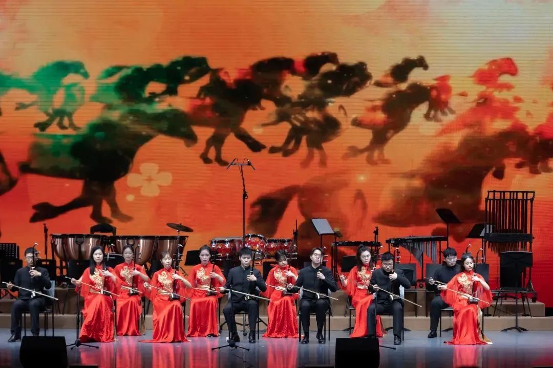 音乐会中,乐团同学们还带来了五首风格各异的民乐重奏和齐奏作品,丝弦五重奏《映山红》汇聚了乐团弹拨五个乐器的首席精英,以嘈嘈切切之势,完美诠释了弹拨类乐曲独有的魅力;改编作品《光明畅想》中,乐团同学们用铿锵激昂的旋律驱散了疫情的阴霾,带来希望的曙光;气势磅礴的锣鼓乐《龙腾虎跃》将音乐会推向高潮,作品通过五位打击乐声部同学的精彩演绎,谱写了鼓群表演的长大段落;一首极具现代化风格的琵琶四重奏《悄然》,描述了静听世间万物从无到有,又自有到无回到泥土里循环往复的过程,从细微到绽放,充分展示了乐团琵琶声部的演奏技巧。一首铿锵磅礴的《战马奔腾》让观众们感受到了青春的热烈和奔放,如战马般,乘着它,定当以梦为马,不负韶华。